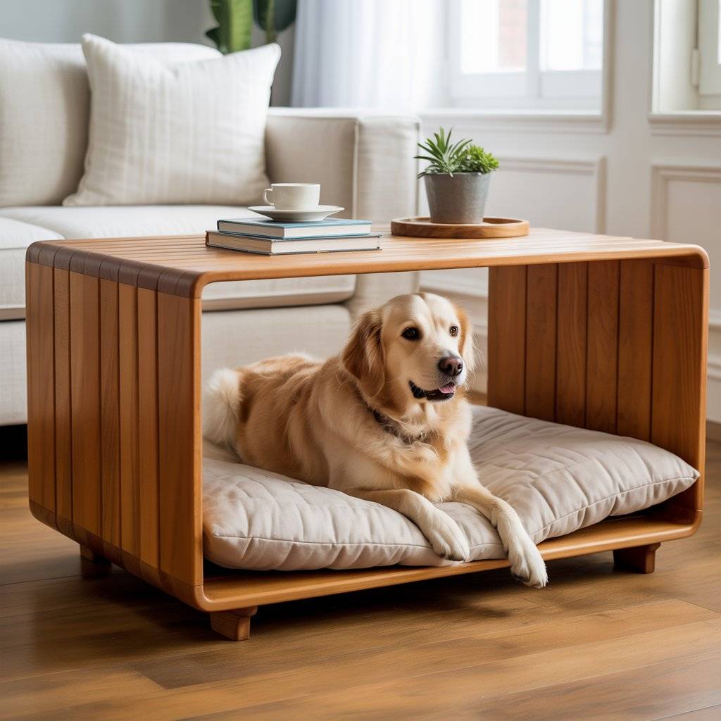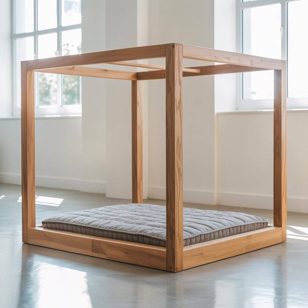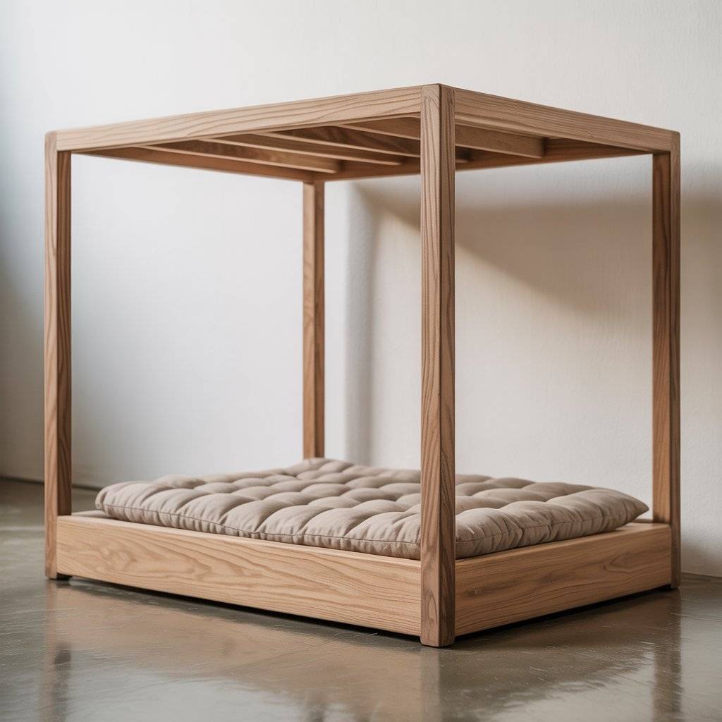 The base remains simple: a wooden frame with a quilted dog mattress inside. The canopy doesn’t need fabric; even a plain wood structure works. It’s a good example of modern wooden dog bed design that adds function without excess.