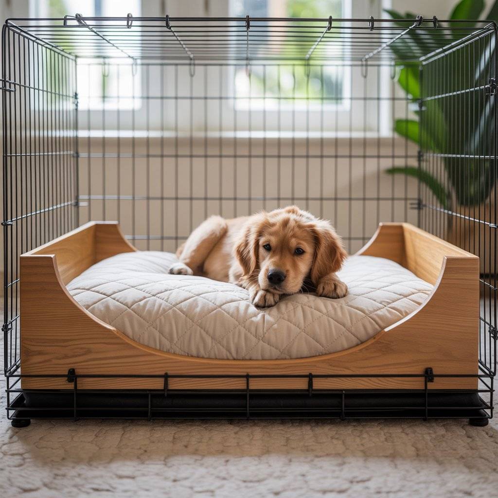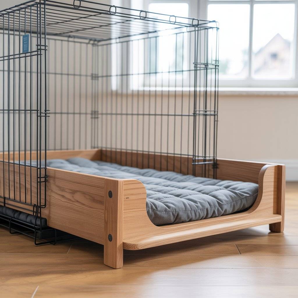 Some people swap standard crate mats for a custom wooden frame pet bed that slides neatly inside the crate.