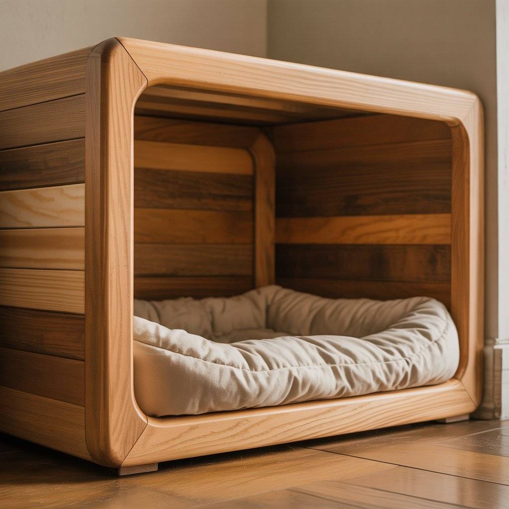 Some pets like a den-like feel. This design uses a wooden box structure with an open front and a quilted dog mattress inside.