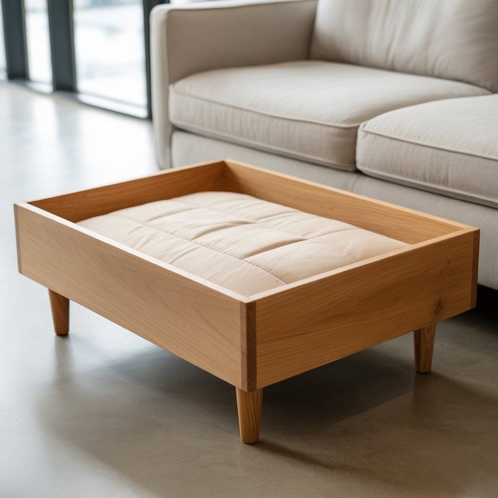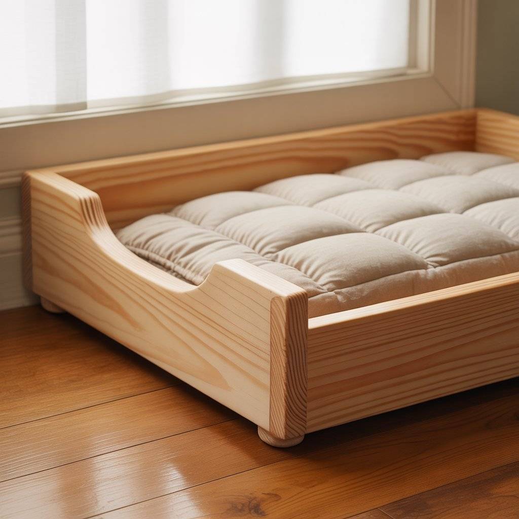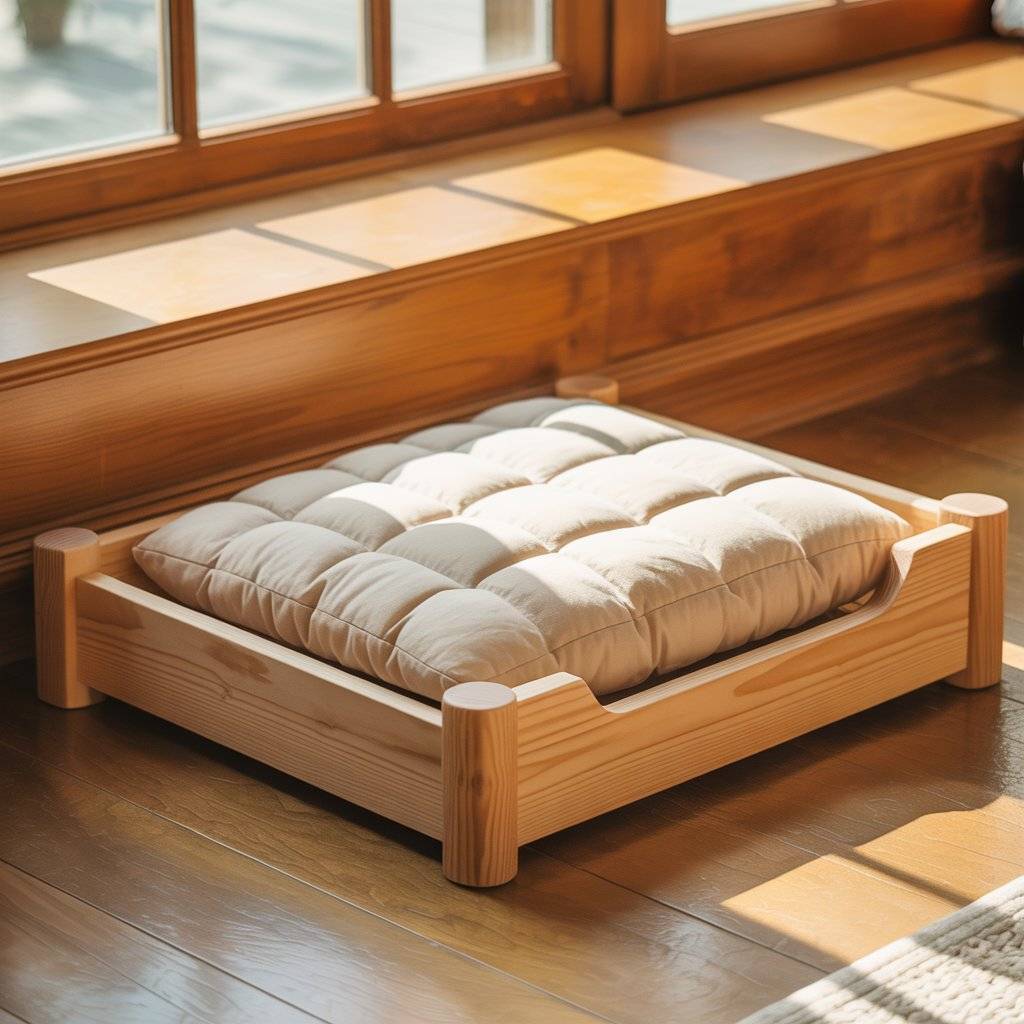 Raised beds are practical, especially for pets that like airflow underneath them. A wooden frame supported by short legs keeps the bed elevated while still being stable. I’ve seen this design used a lot in modern dog bed setups where function matters just as much as looks.