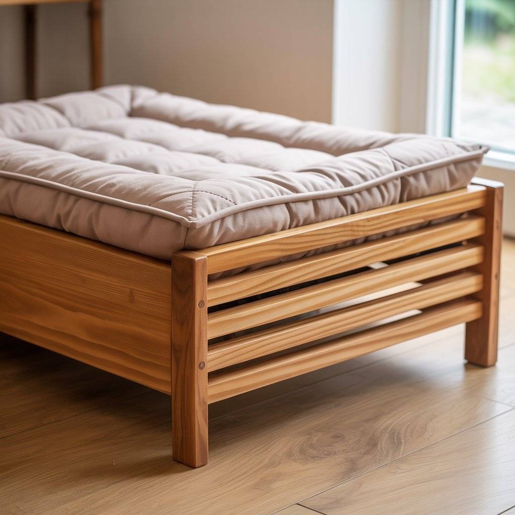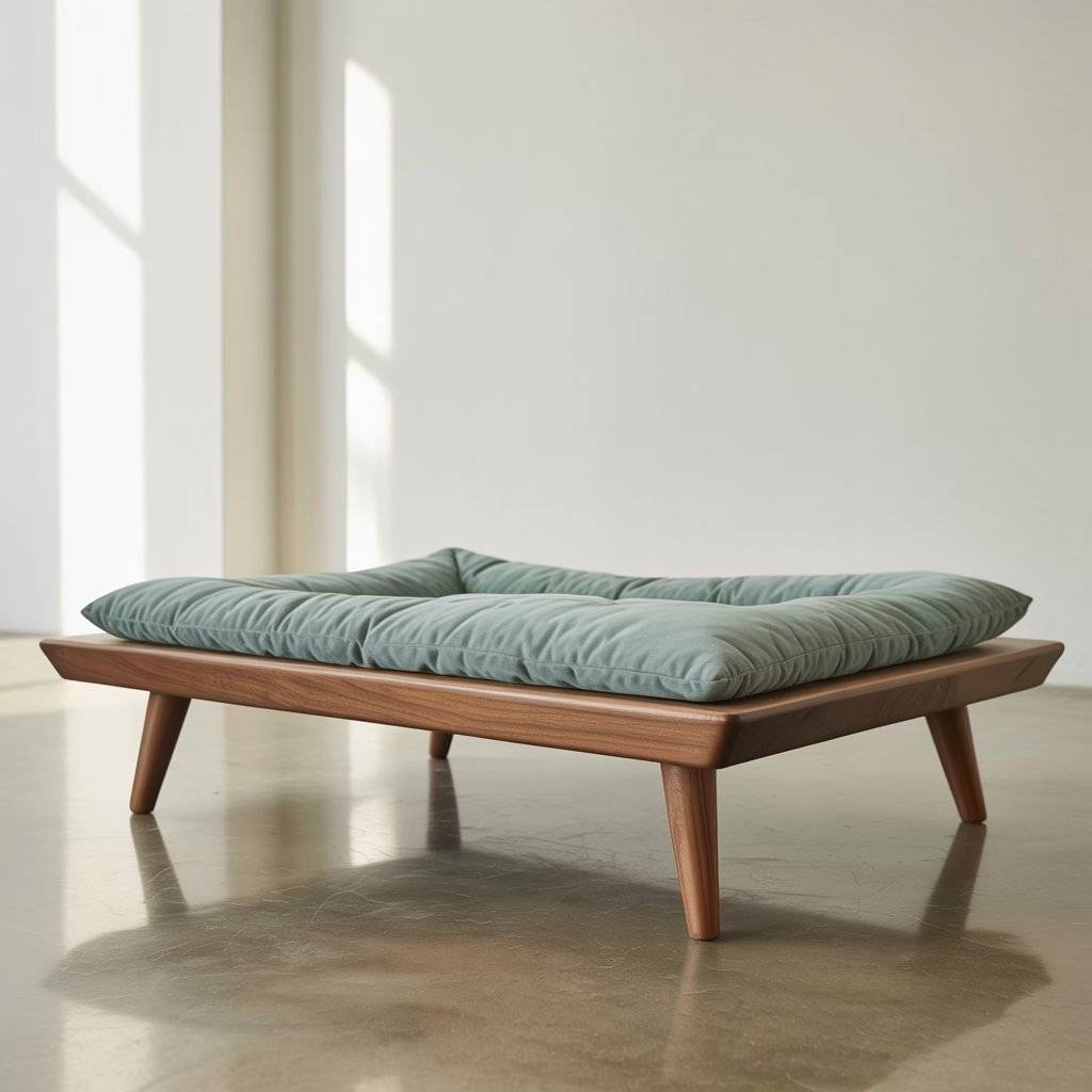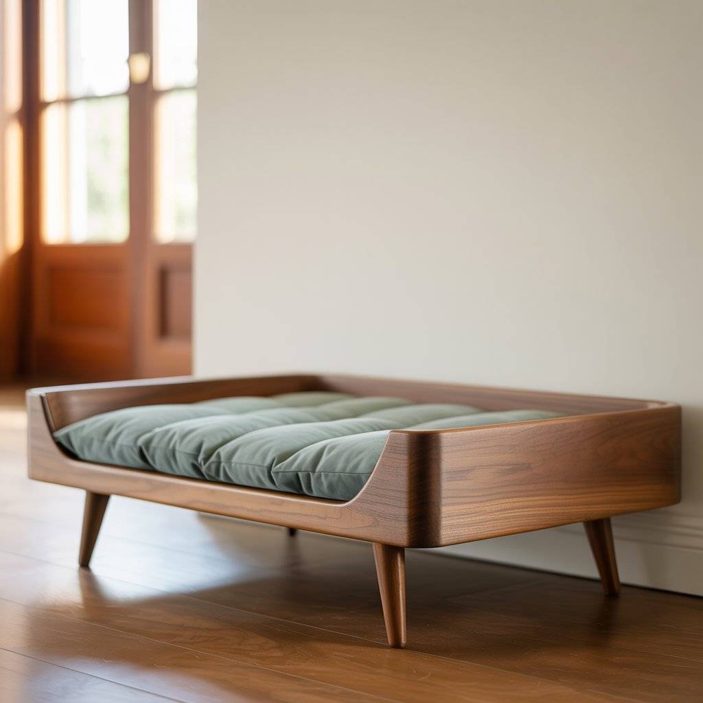 Raised beds are practical, especially for pets that like airflow underneath them. A wooden frame supported by short legs keeps the bed elevated while still being stable. I’ve seen this design used a lot in modern dog bed setups where function matters just as much as looks.