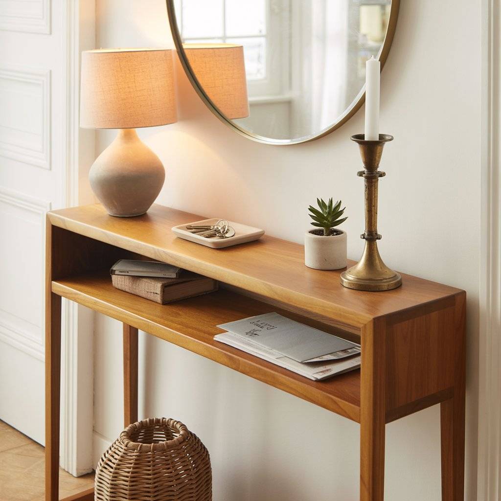 A slim wood console behind a sofa or in an entryway is deceptively practical: keys, a lamp, a tray for mailall while adding warmth.