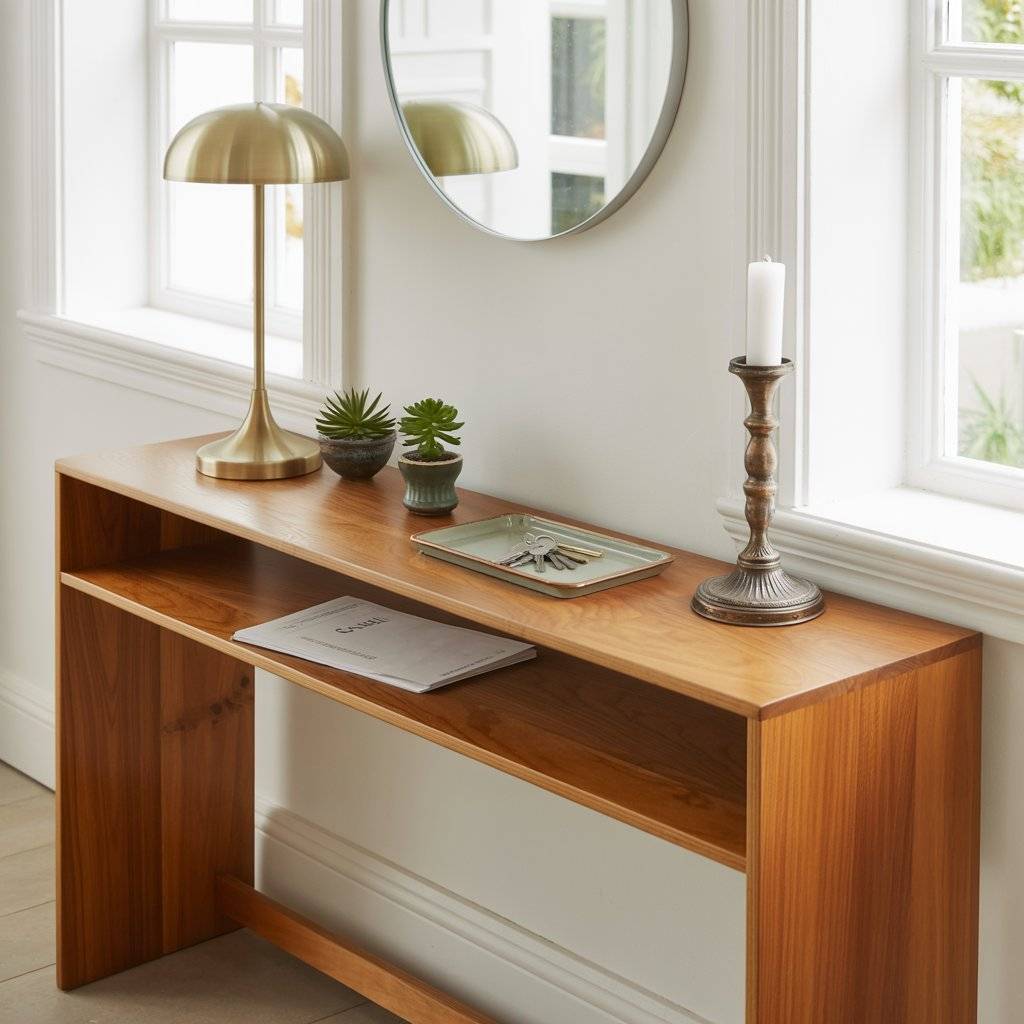 Choose an open-bottom console to avoid heaviness in small spaces. Style with a mirror above and a couple of meaningful objects; it should feel curated, not staged.