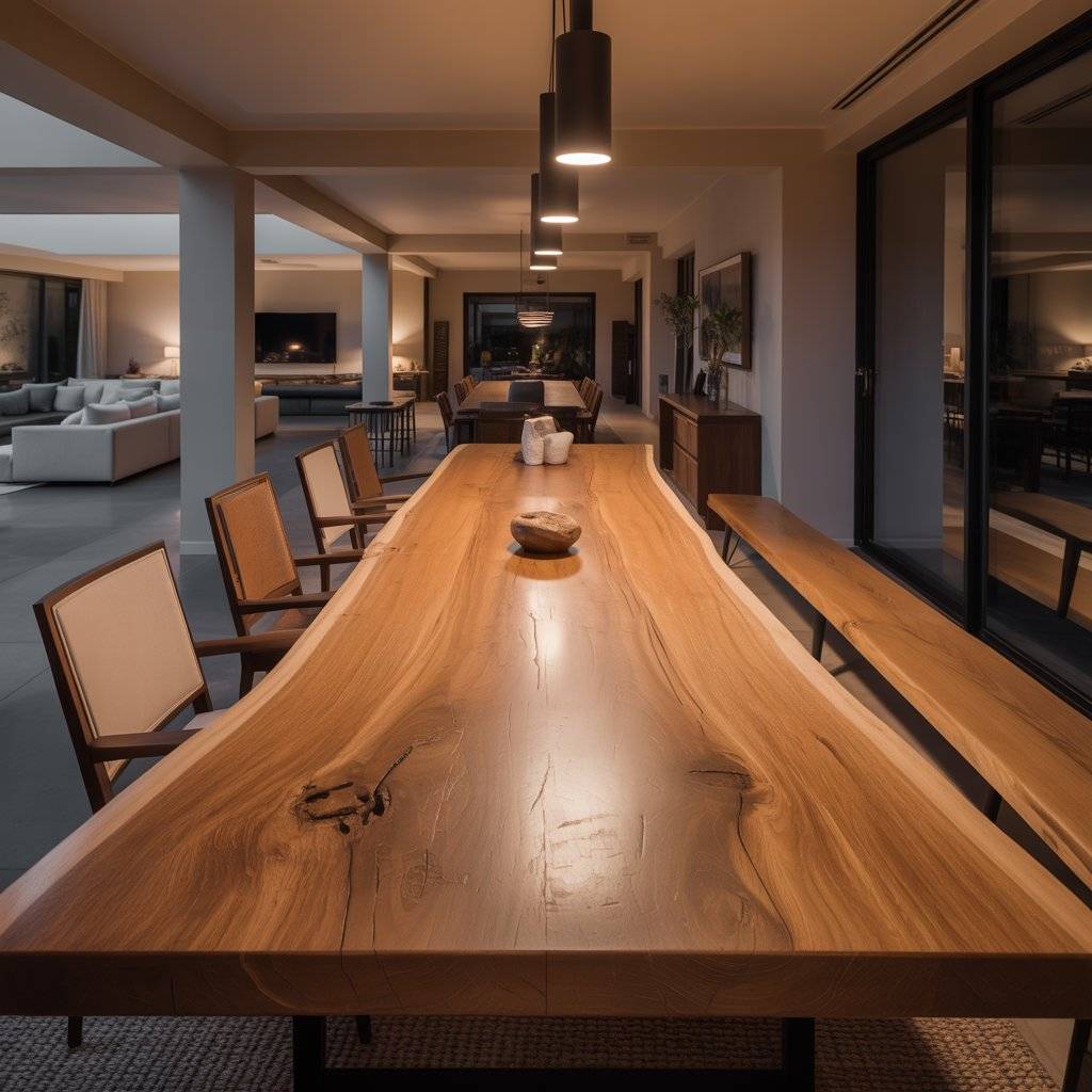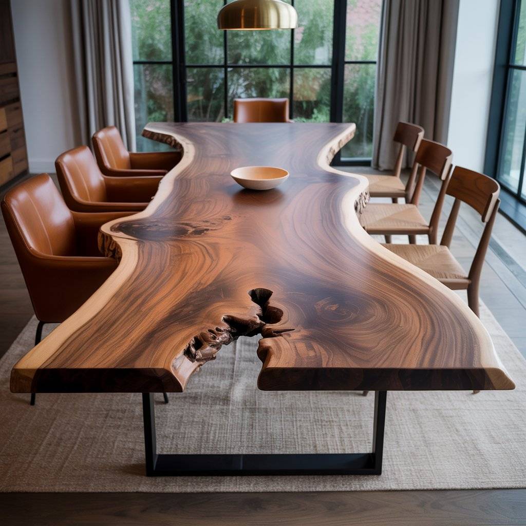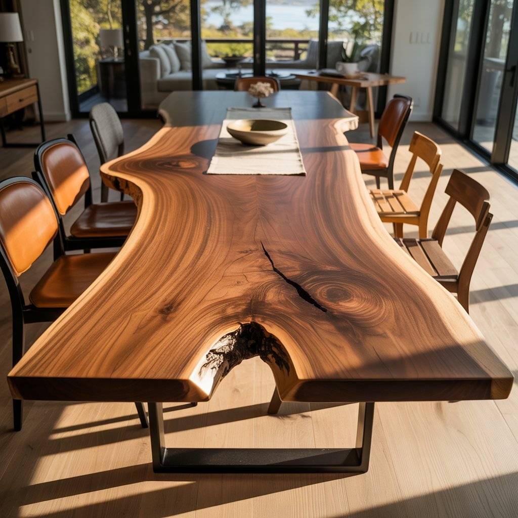 A live-edge table keeps the tree’s outer shape intact, so every curve and knot shows. It’s bold without trying too hard. Put this in a room with big windows or a simple pendant light and you’ll have something that still looks interesting after years of family dinners.