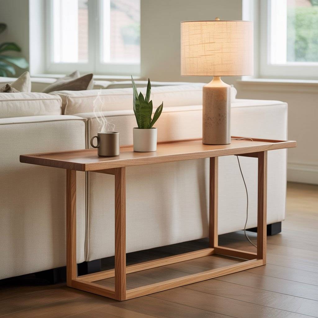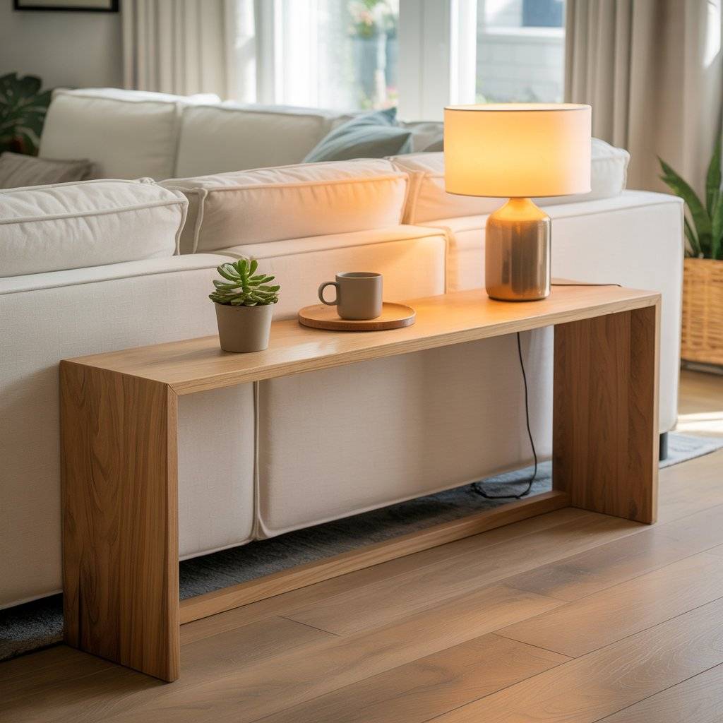 A slim table behind the sofa is one of those clever solutions people forget about until they need it. It gives you somewhere to rest a lamp, a plant, or a cup without blocking the room’s flow. Choose a light wood to keep the space airy, or a darker wood to create contrast behind a pale sofa.