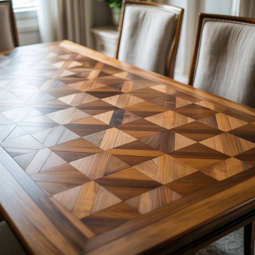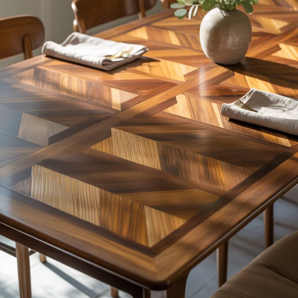 Parquet brings pattern to the tabletop without shouting. Geometric wood inlays make the surface feel thoughtful and sophisticated.