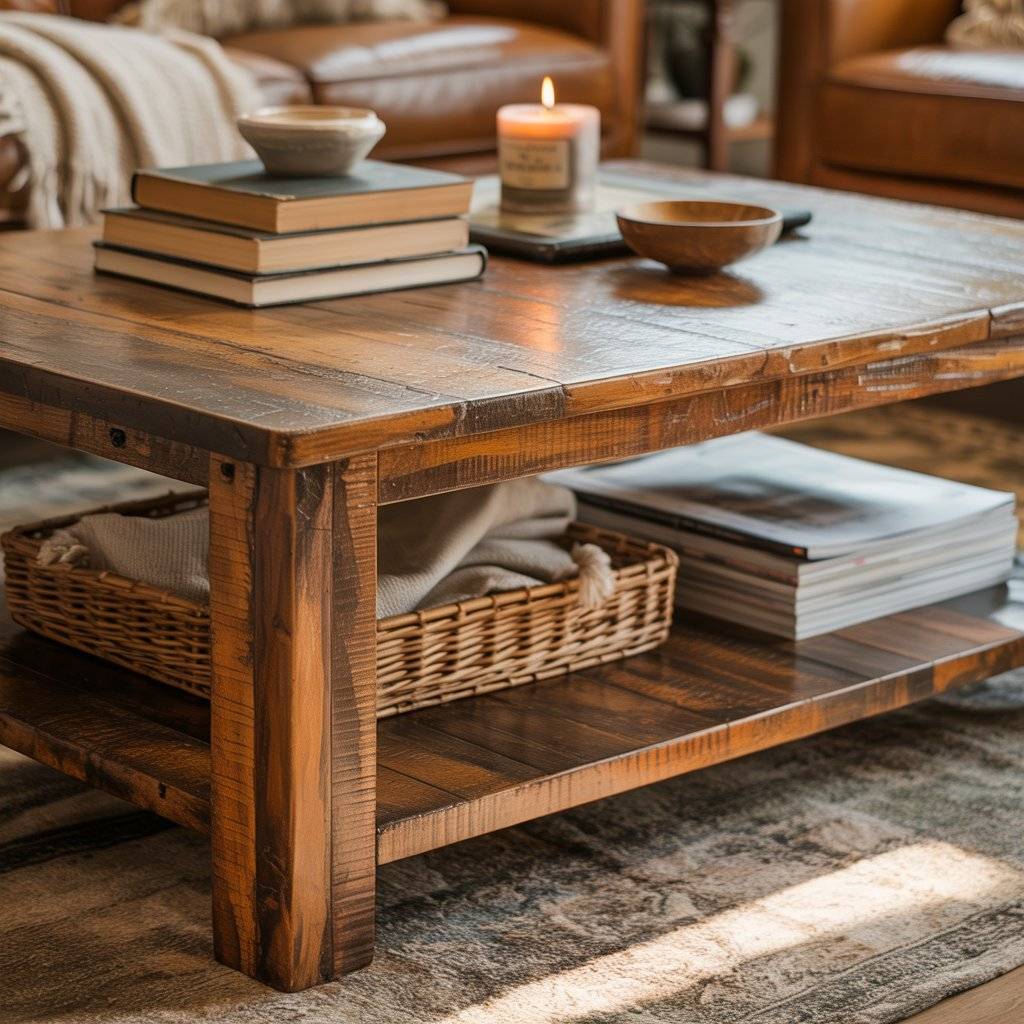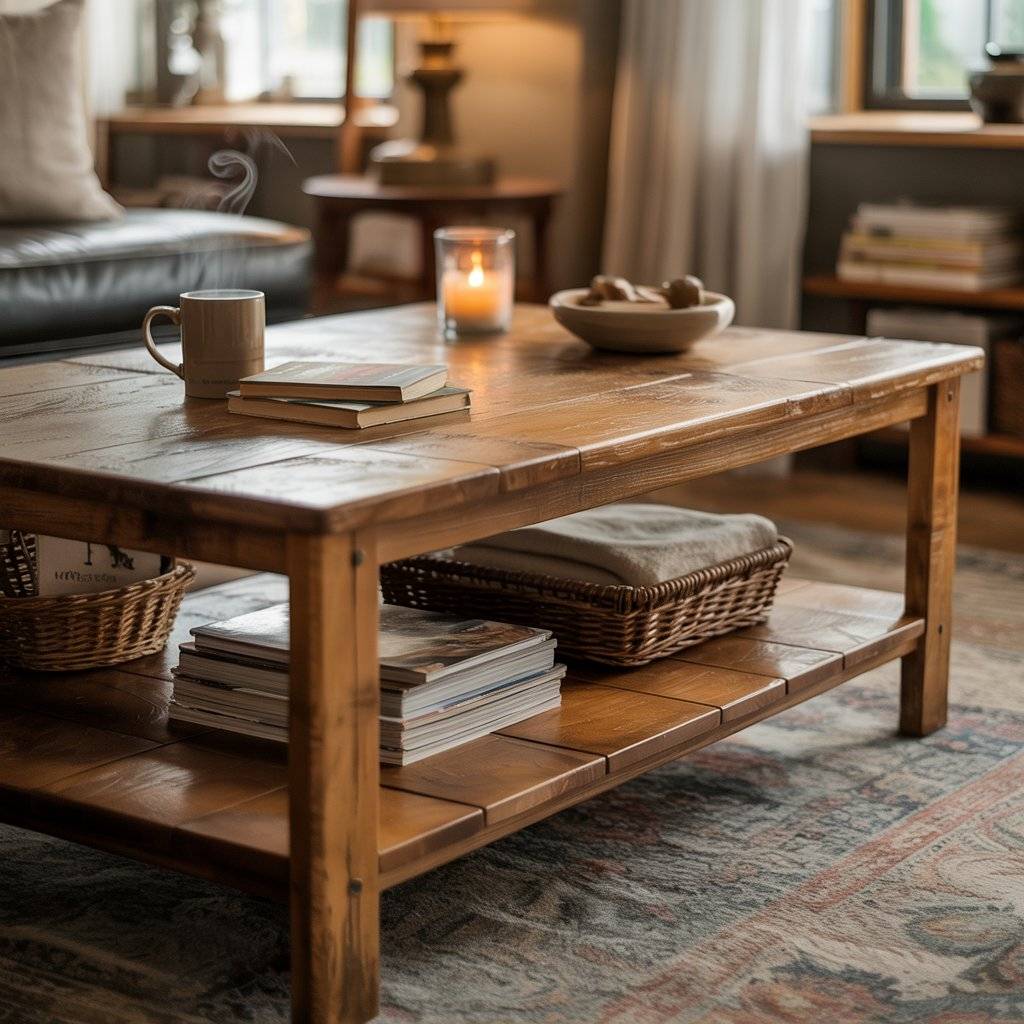 A coffee table with a lower shelf keeps the living room tidy without losing that rustic charm. Use the shelf for baskets, magazines, or throws; keep the top for cups and a small cluster of itemsa stack of books, a candle, maybe a bowl. The right wood finish makes it forgiving of daily life, so spills and scuffs just add to its personality.