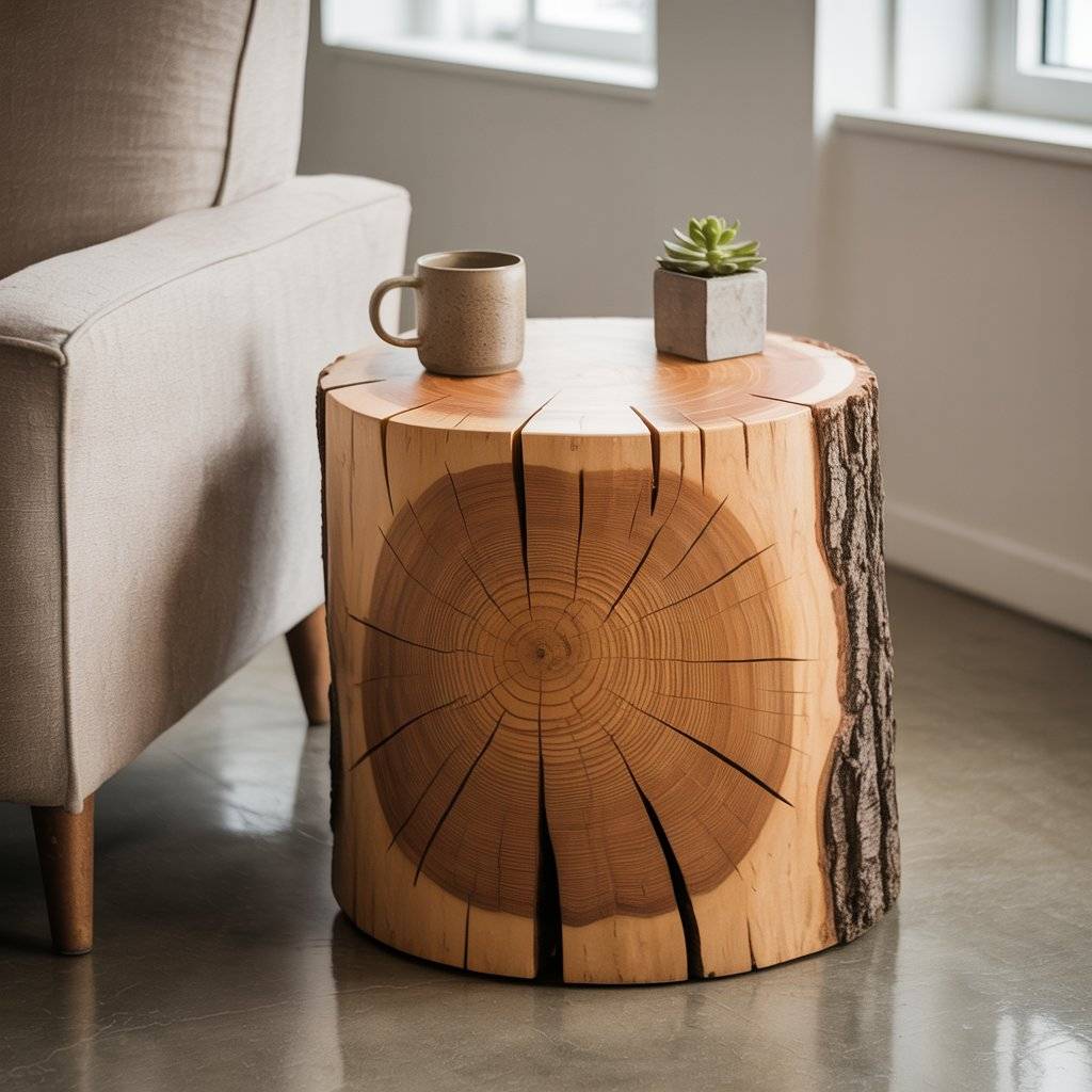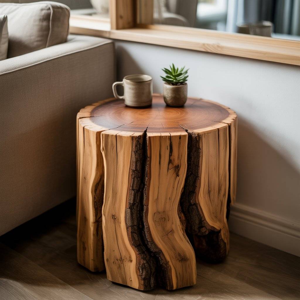 Place one beside an armchair, use it to hold a lamp or a cup, and keep surrounding décor minimal so the grain can do all the talking.