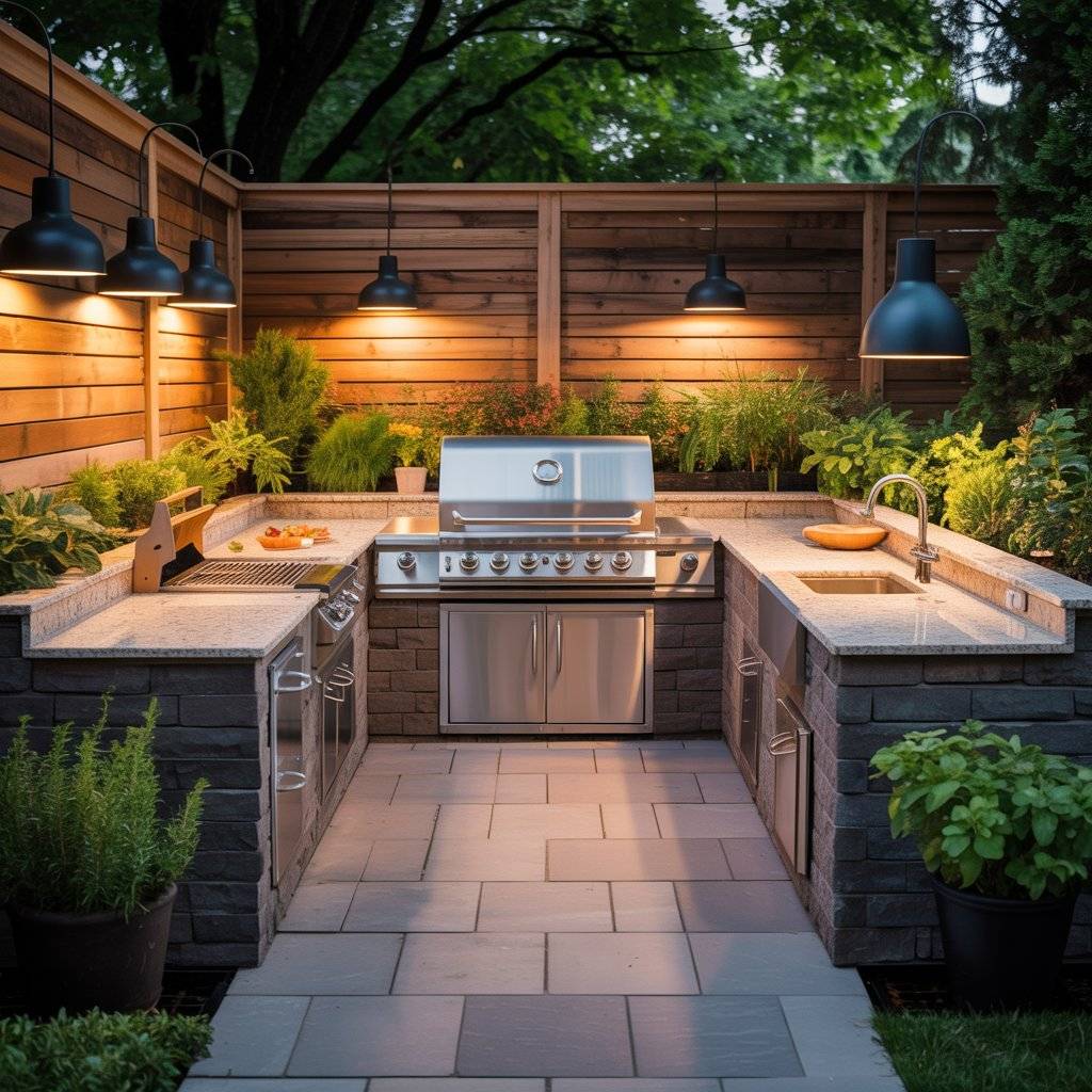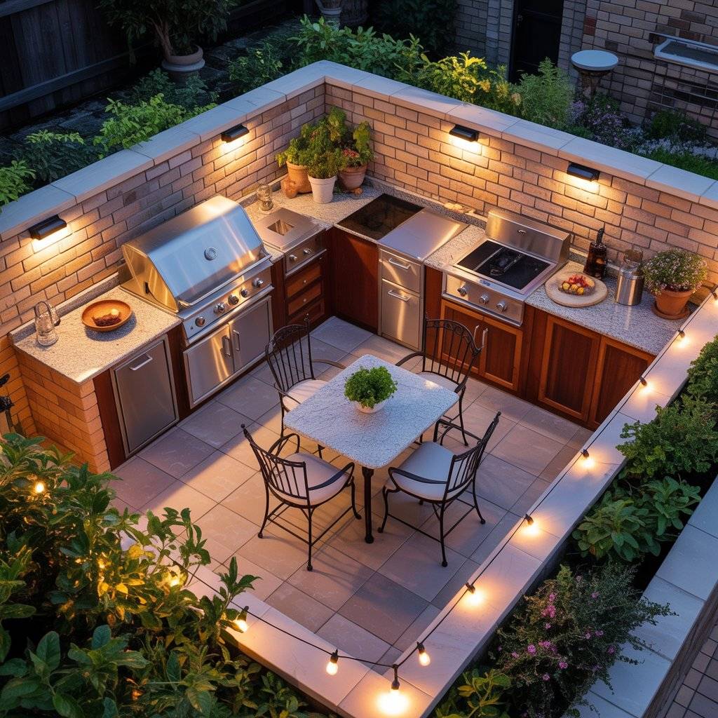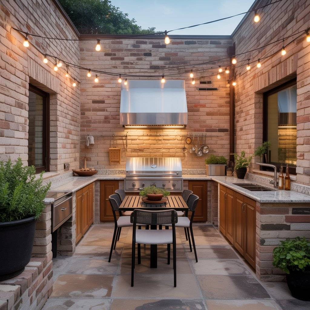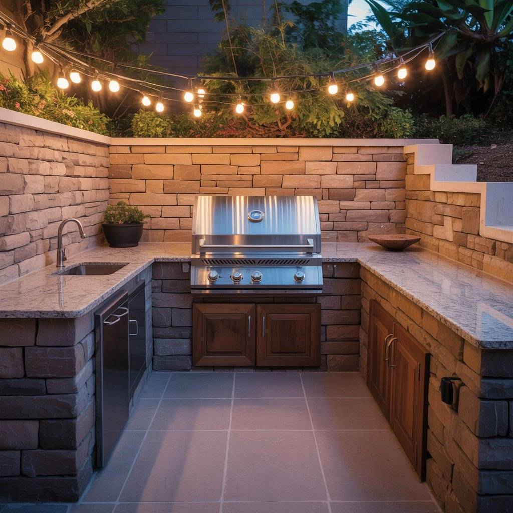 This layout doesn’t need a lot of space to work well. Even a modest courtyard can hold a grill, prep counter, and a small seating area. With good lighting and durable surfaces, it becomes a practical outdoor kitchen that people can enjoy day or night.