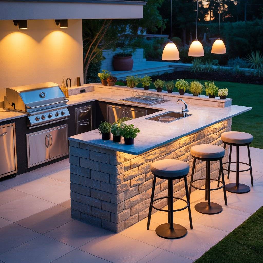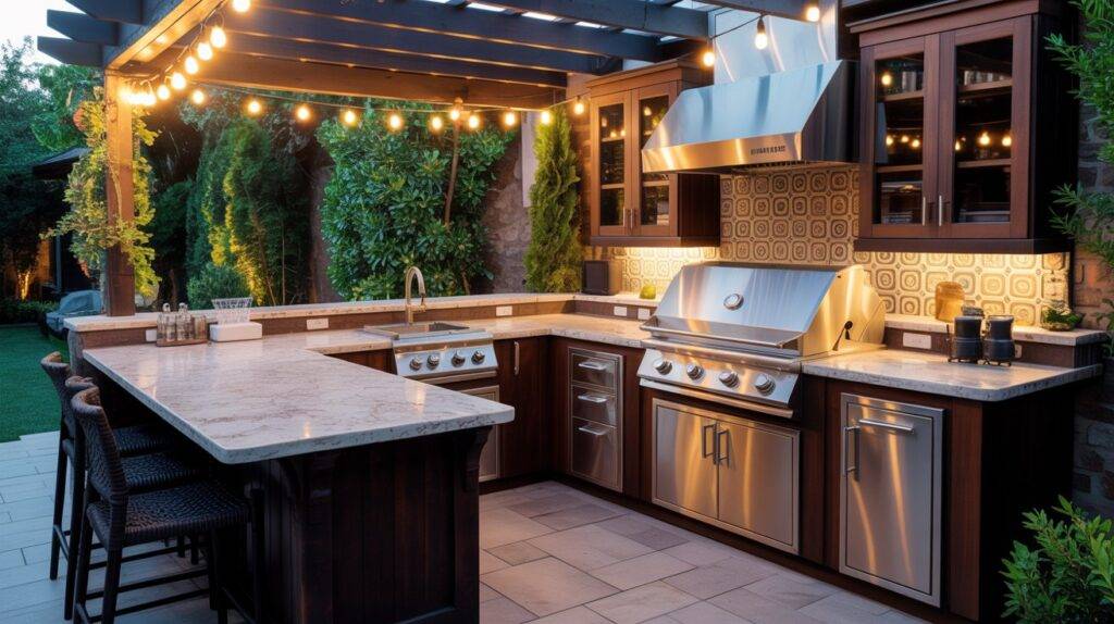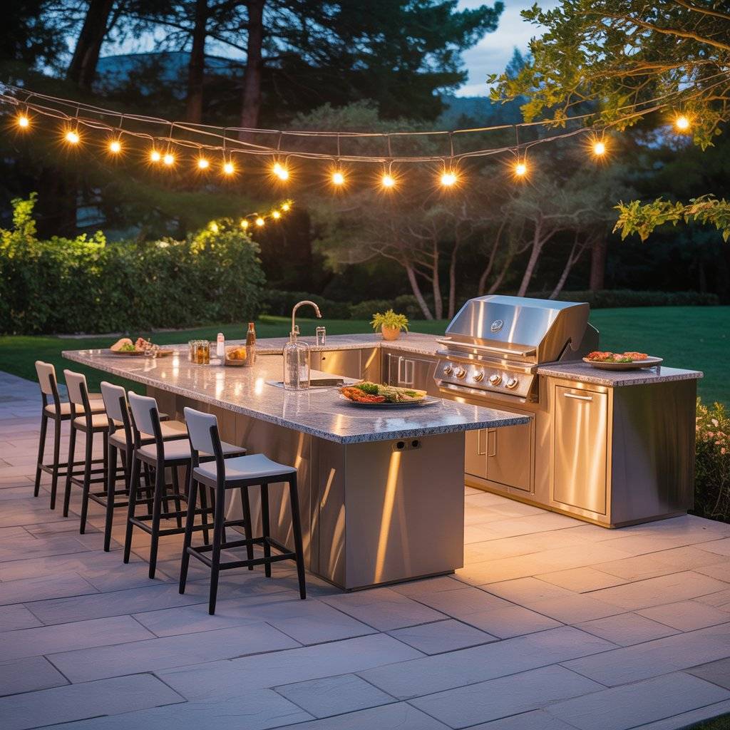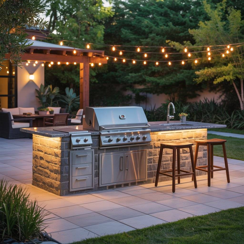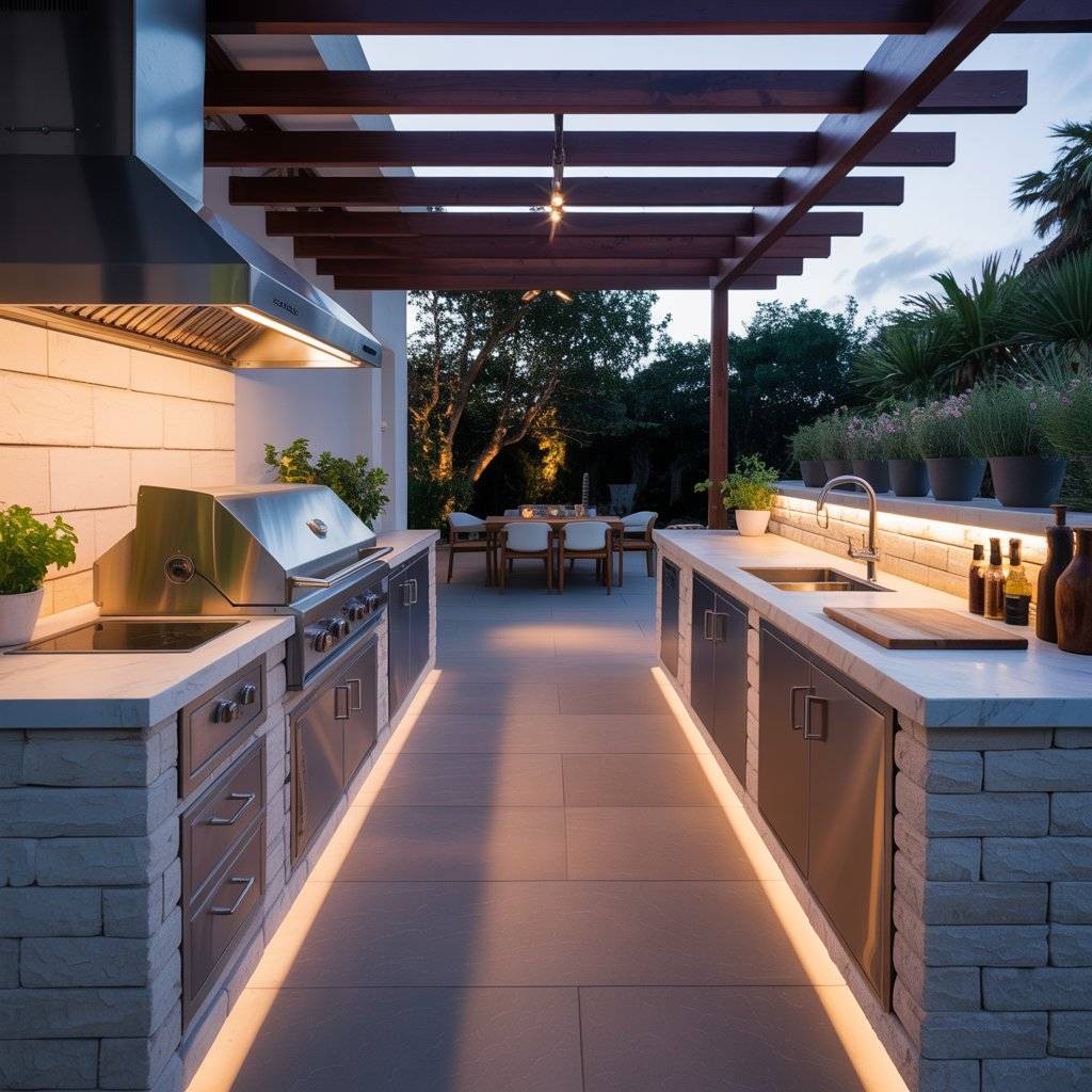 This layout doesn’t need a lot of space to work well. Even a modest courtyard can hold a grill, prep counter, and a small seating area. With good lighting and durable surfaces, it becomes a practical outdoor kitchen that people can enjoy day or night.
