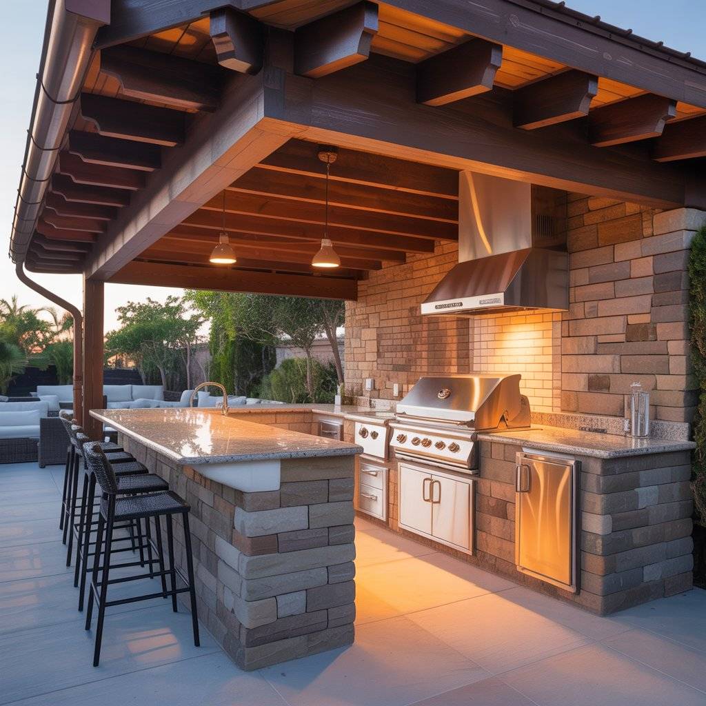 I’ve seen this layout used where the grill and prep counter sit along the back wall of the patio while the seating area stays nearby. The roof provides shade and protects the appliances from rain, which helps everything last longer.