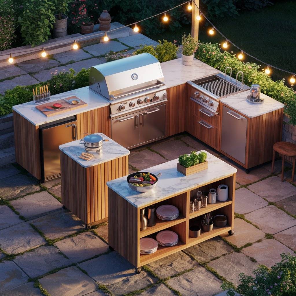 In these cases, the design stays simple. A small grill, a narrow prep counter, and maybe a compact storage cabinet can be enough to create a functional cooking space. Folding tables or rolling carts can also help add extra prep space when needed.