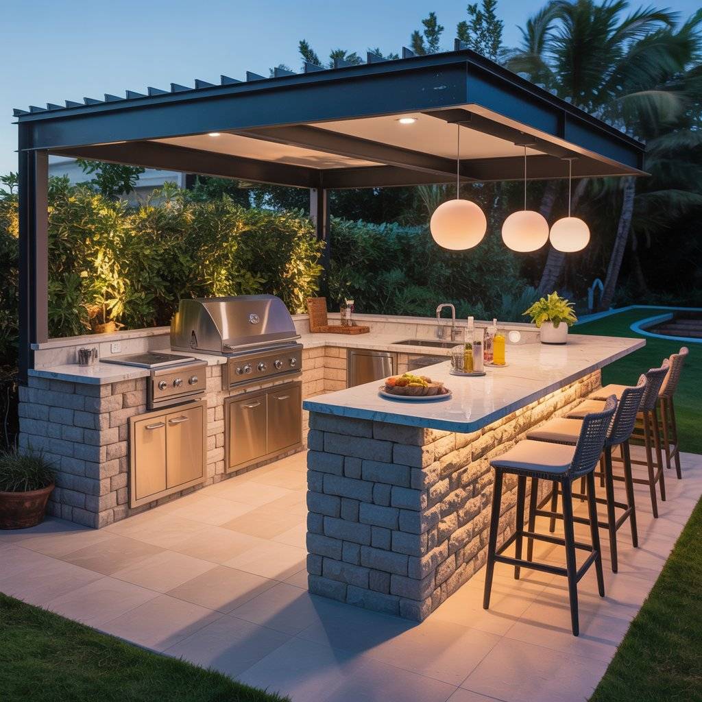 This layout doesn’t require complicated construction either. Even a basic wood or metal pergola can turn a simple outdoor kitchen into a comfortable cooking space.