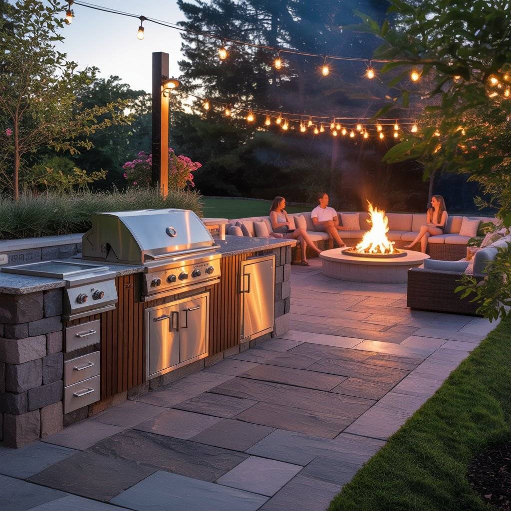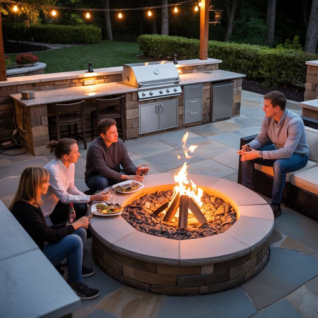 In one backyard setup, the grill station sat along the patio wall while a circular fire pit area was only a few steps away. After the food was ready, everyone naturally moved to the fire pit to sit, eat, and talk. It created a comfortable flow from cooking to gathering.