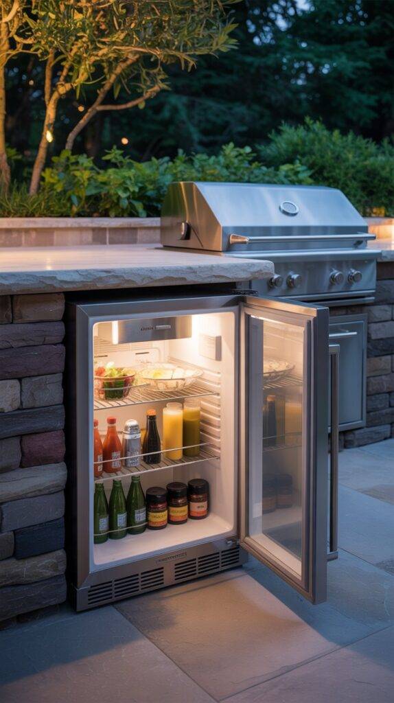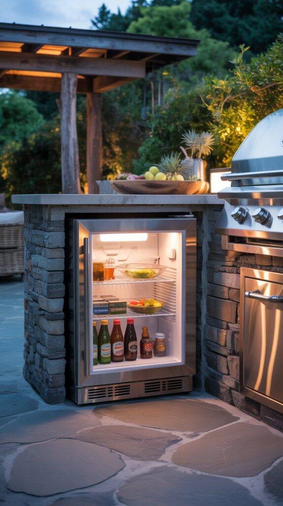 Instead of running back into the house for drinks, sauces, or ingredients, everything stays right where you’re cooking. I’ve seen outdoor kitchens where the fridge sits under the prep counter, which keeps the design clean while still being easy to access.