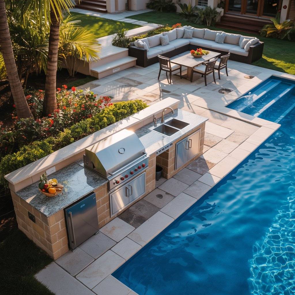 Usually the grill and prep counters are placed along one side of the pool patio, leaving enough space for safe walking paths. Some setups include a small fridge or cooler for drinks so people don’t have to run inside the house.