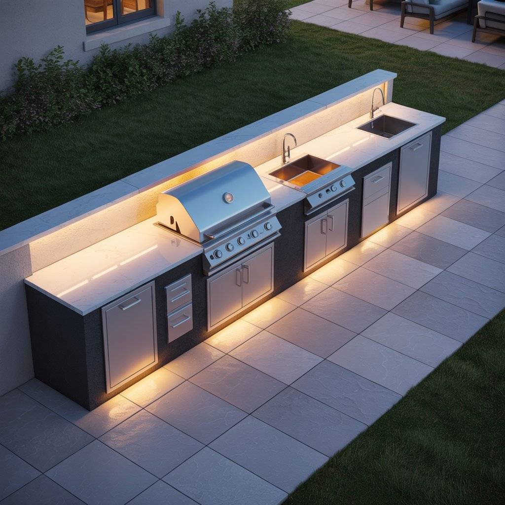One layout I’ve seen work really well, especially in smaller yards, is the straight line kitchen. Everything sits along one wall or one long counter. The grill goes in the center, with prep space on one side and a small sink or cooler on the other.