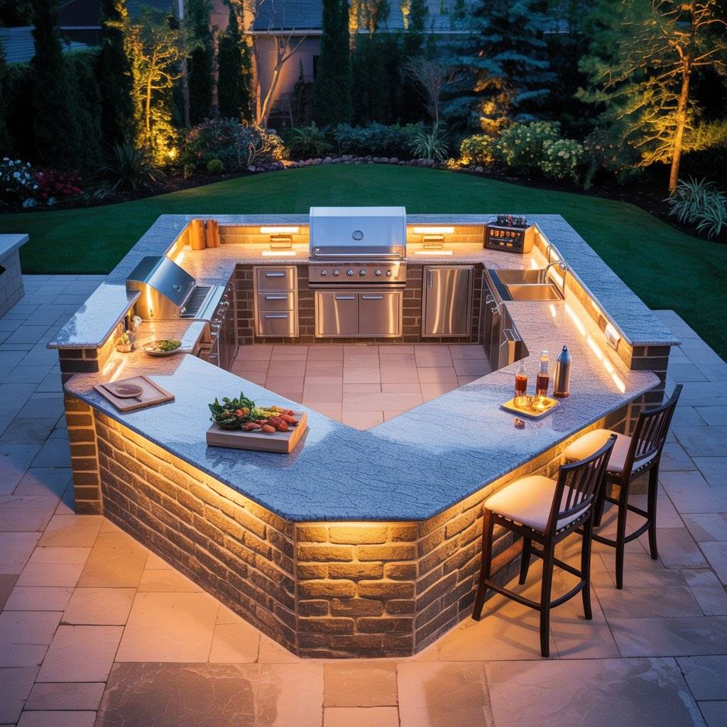 If you want a layout that feels like a full cooking station, the U-shape is worth considering. This design surrounds the cook with counters on three sides. The grill sits in the center section, while the other sides hold prep space, storage, or a sink.