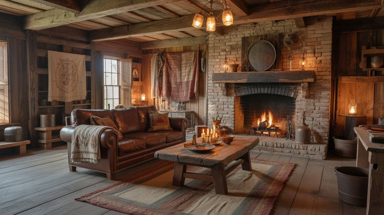 Texture plays a big role in making a space feel warm and real. In my own projects, I like mixing materials like leather, linen, wool, and raw wood. A brown leather chair, even a simple one, instantly adds depth to the room. Over time, leather develops a natural patina, which fits perfectly with primitive style.
