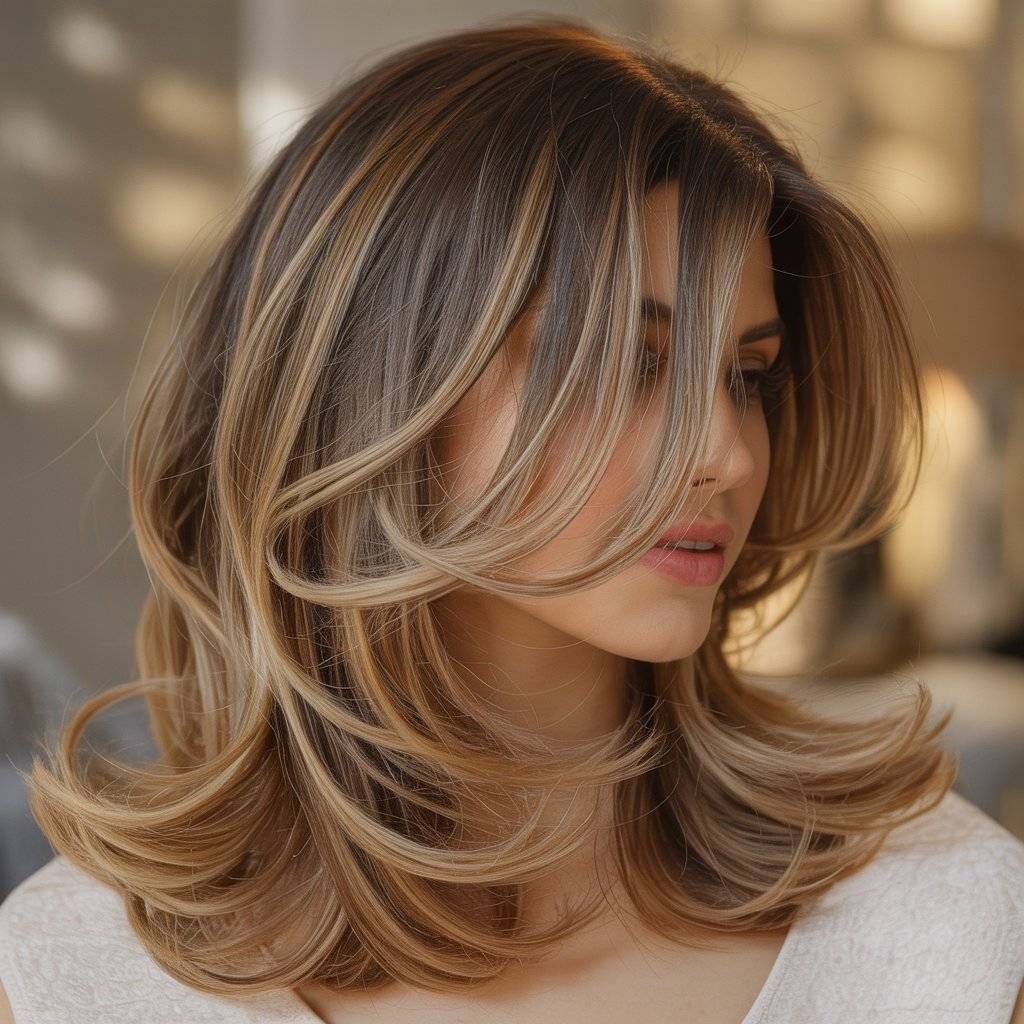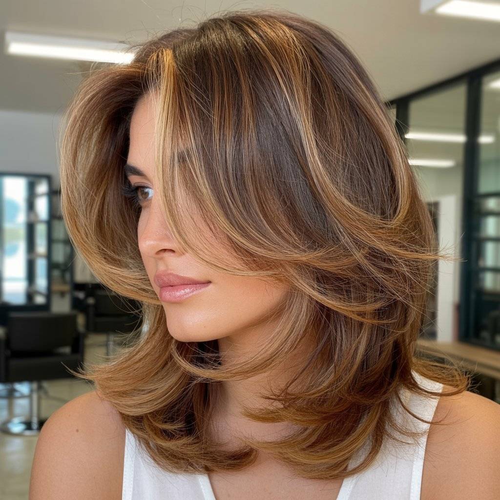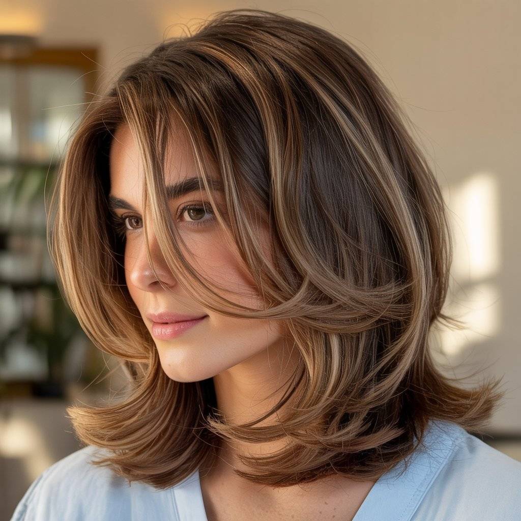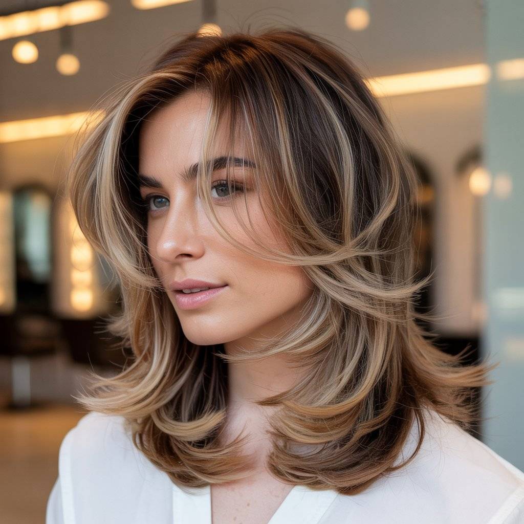 Adding a few highlights along the feathered edges brightens the face and gives a modern touch. It’s practical for medium-length hair and works well whether your hair is thick or fine. This style looks effortless but polished, perfect for everyday life or special occasions.