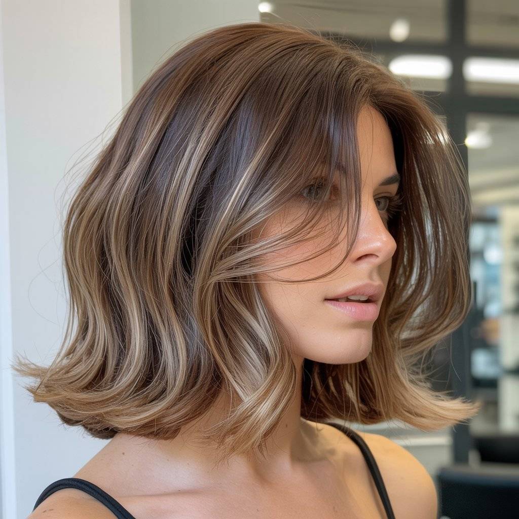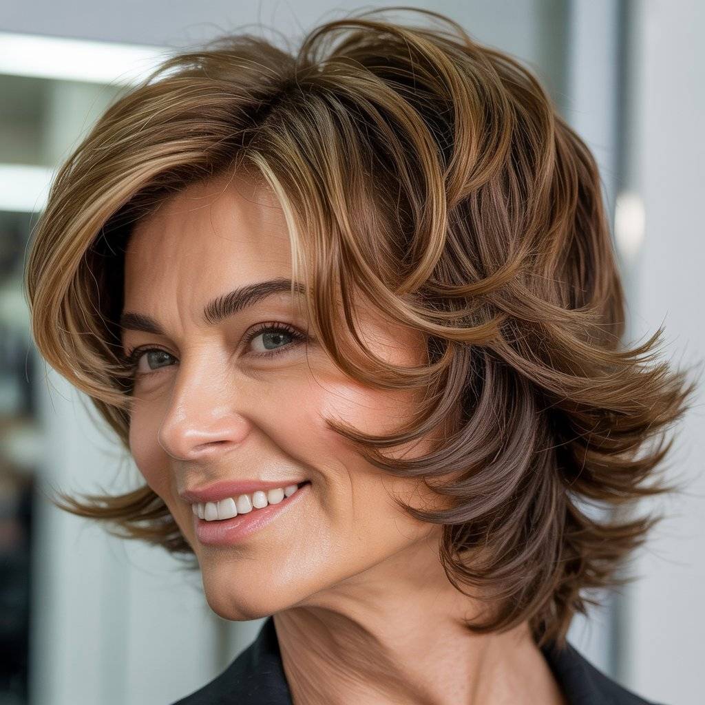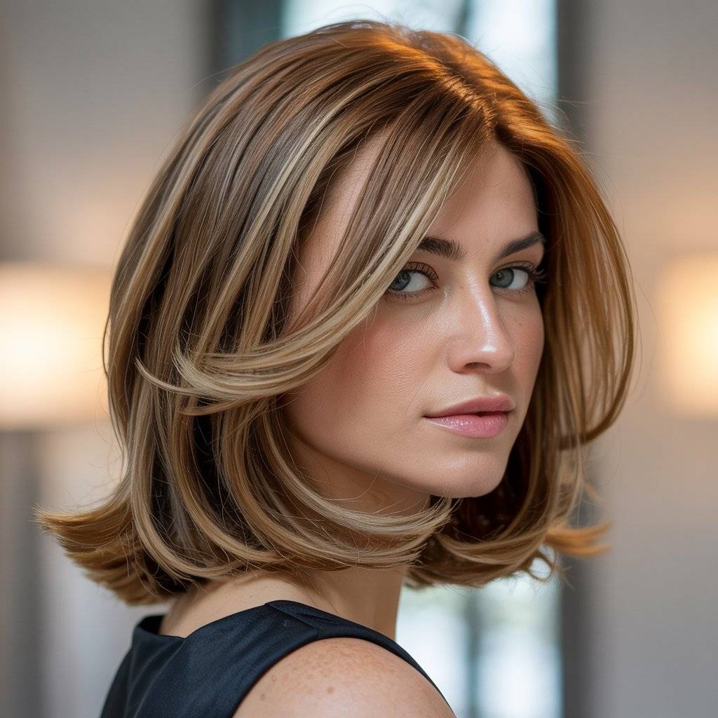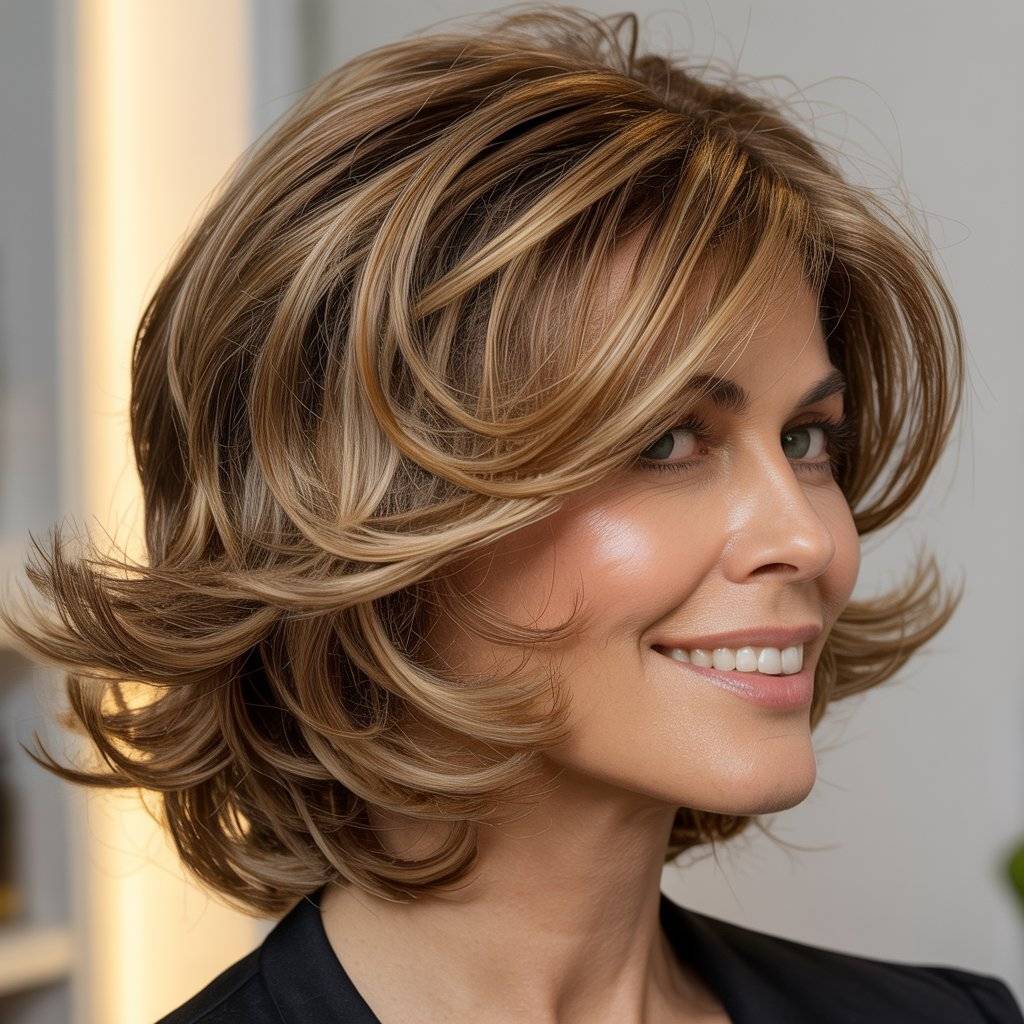 Adding a few highlights along the feathered edges brightens the face and gives a modern touch. It’s practical for medium-length hair and works well whether your hair is thick or fine. This style looks effortless but polished, perfect for everyday life or special occasions.