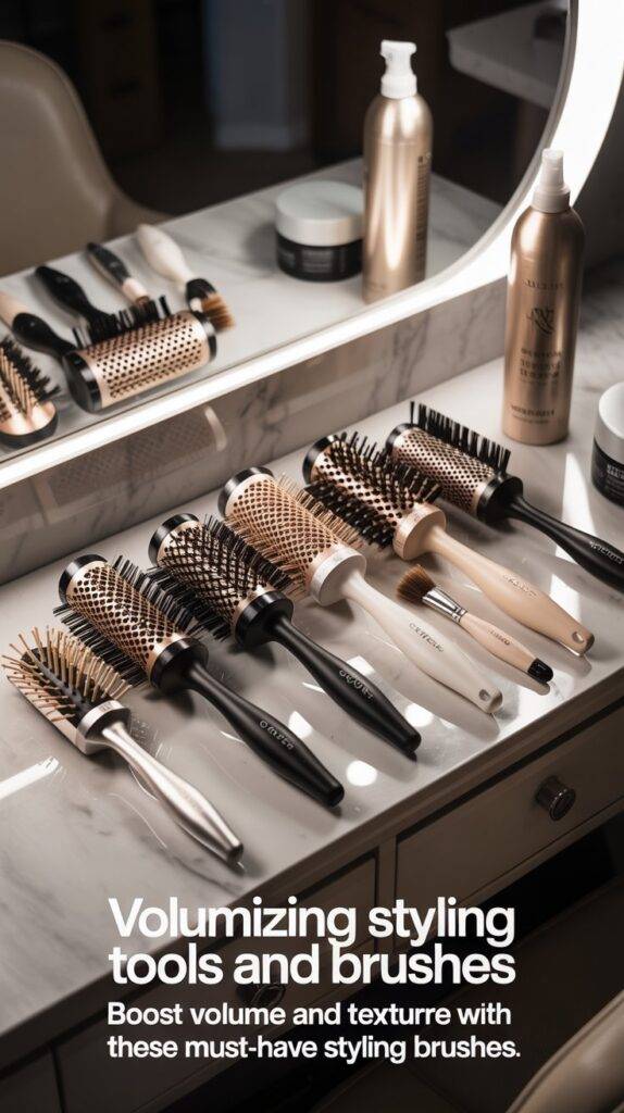 Round brushes, vent brushes, and texturizing brushes help lift the roots, smooth ends, and add movement without extra products.