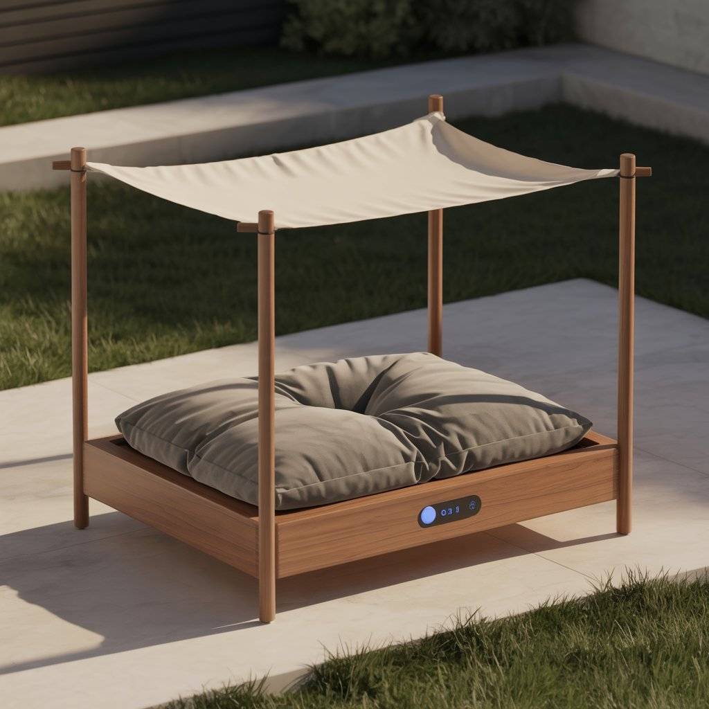 Build a raised wooden frame with a waterproof cushion cover. Inside the cushion, use a smart cooling or heating pad many are USB-powered or solar-friendly. Add a simple roof made of UV-resistant fabric to give shade.
