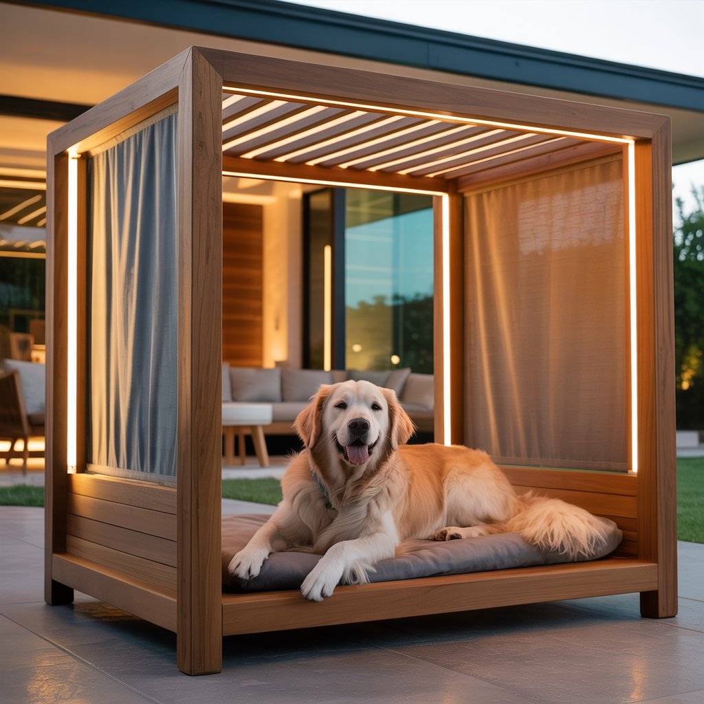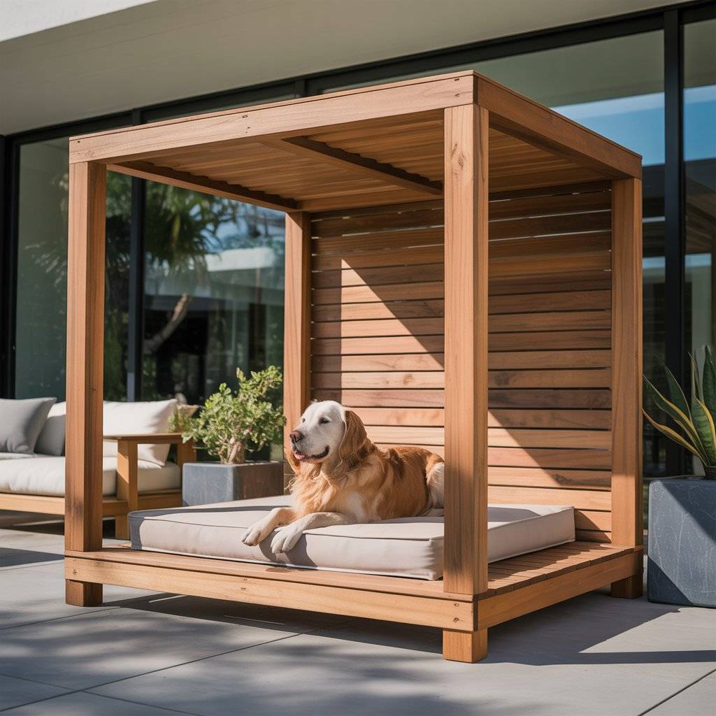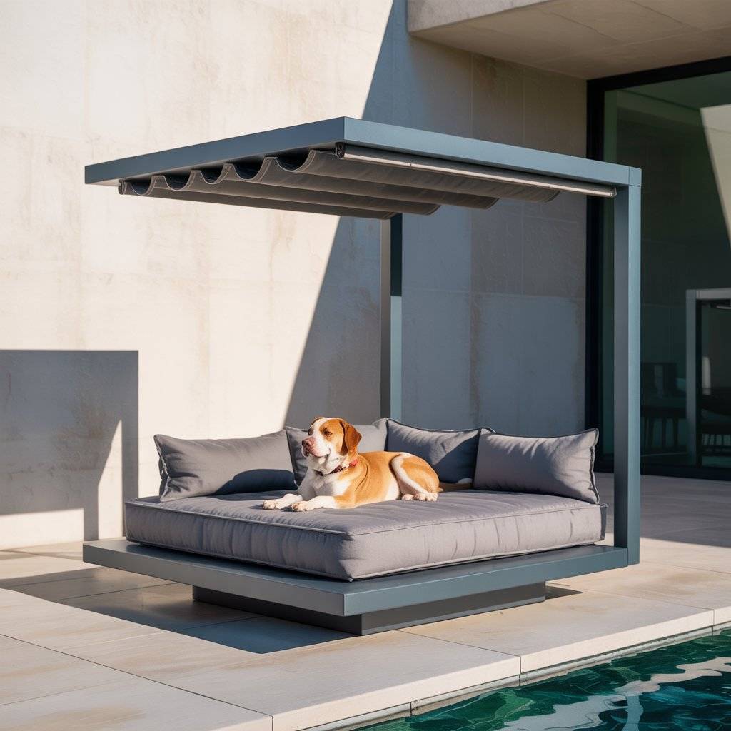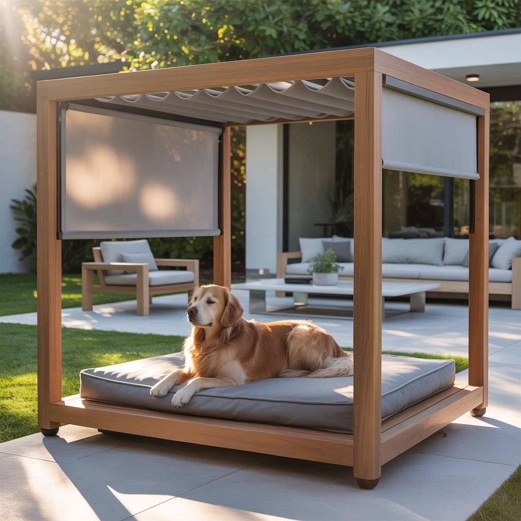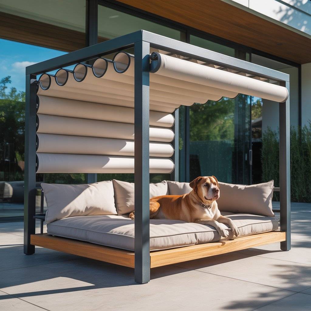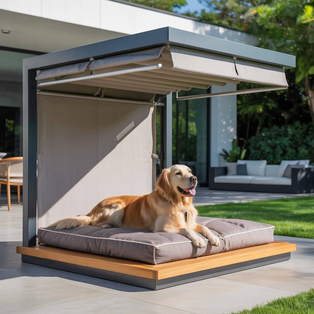 Imagine a smaller version of a modern backyard pergolabuilt just for your dog. Create a mini pergola bed using smooth cedar or metal beams, then add a smart retractable shade that opens or closes automatically with light sensors. Underneath, place a raised waterproof cushion or memory foam pad.