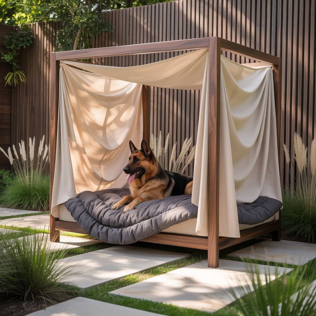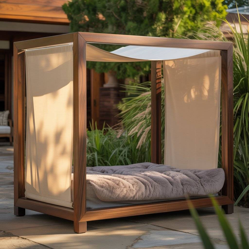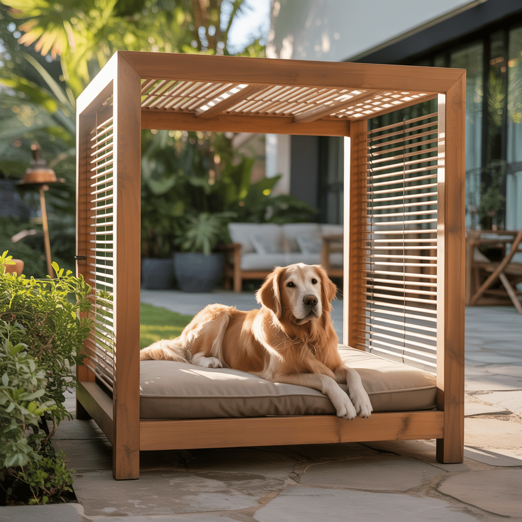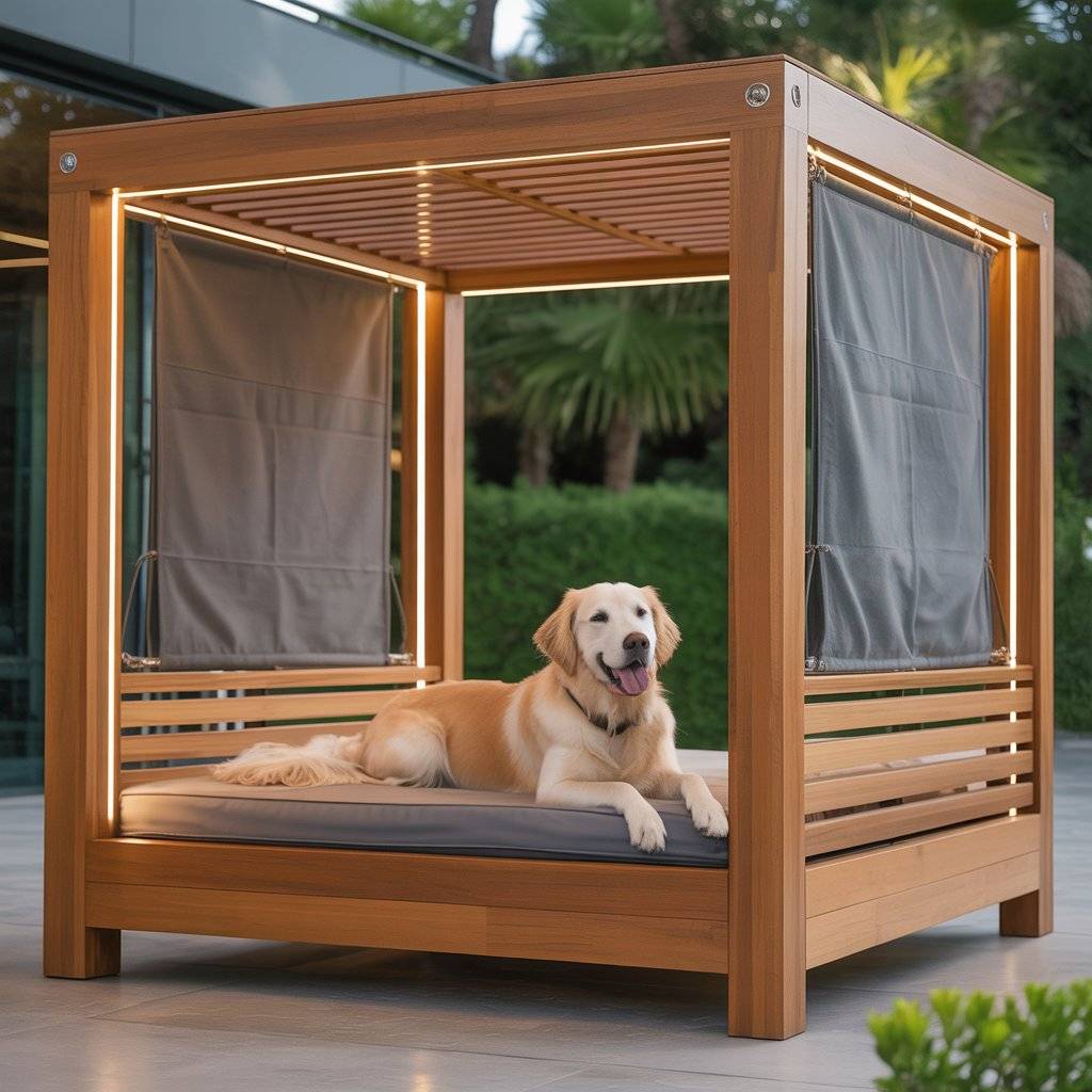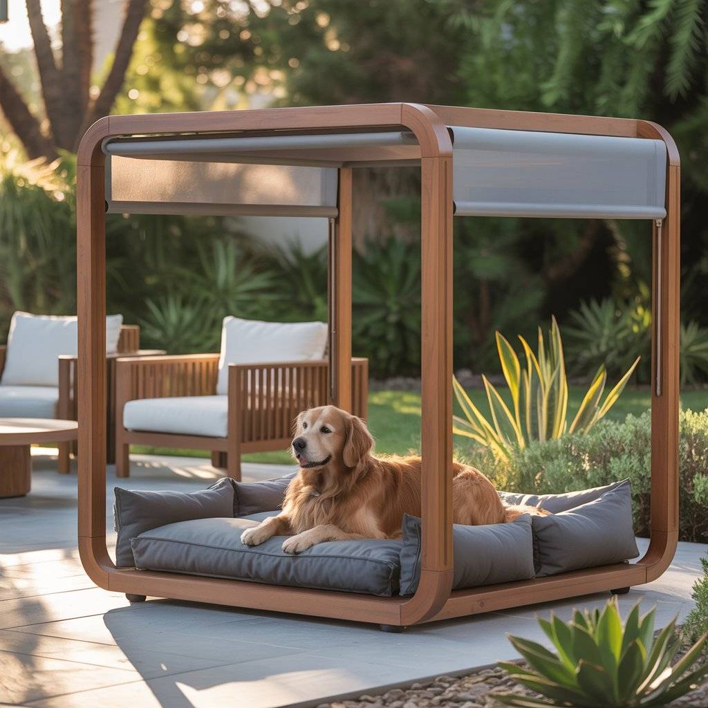 Imagine a smaller version of a modern backyard pergolabuilt just for your dog. Create a mini pergola bed using smooth cedar or metal beams, then add a smart retractable shade that opens or closes automatically with light sensors. Underneath, place a raised waterproof cushion or memory foam pad.