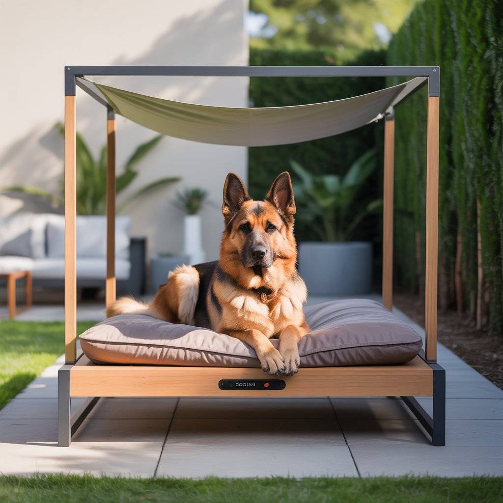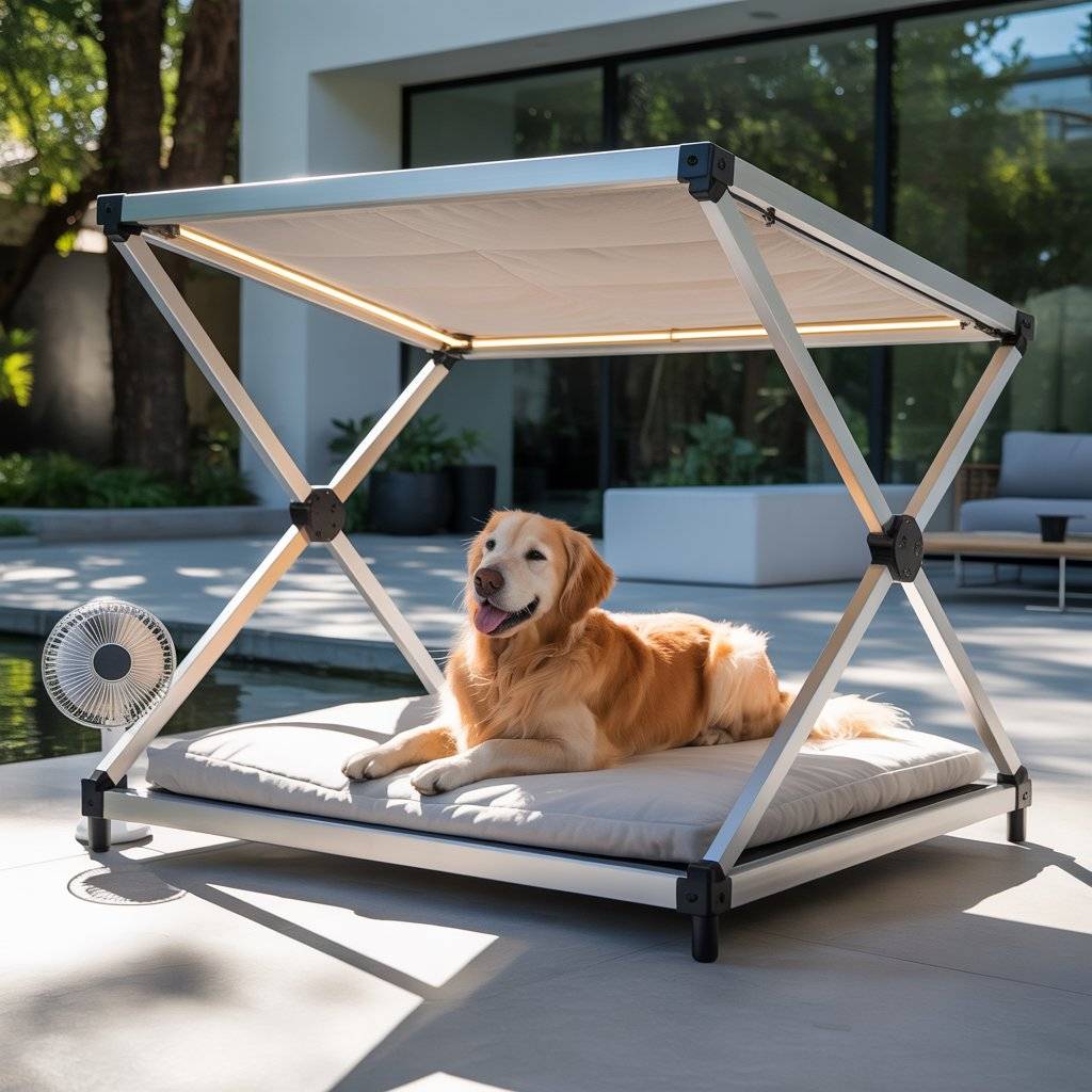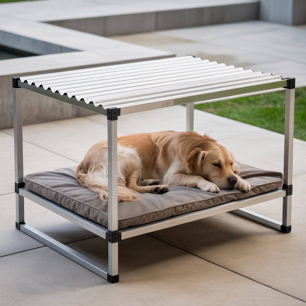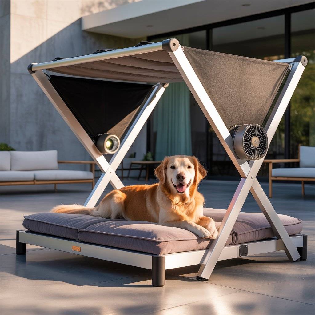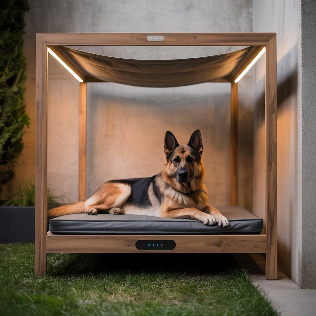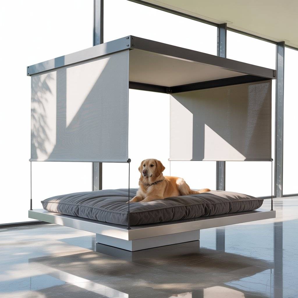 Imagine a smaller version of a modern backyard pergolabuilt just for your dog. Create a mini pergola bed using smooth cedar or metal beams, then add a smart retractable shade that opens or closes automatically with light sensors. Underneath, place a raised waterproof cushion or memory foam pad.