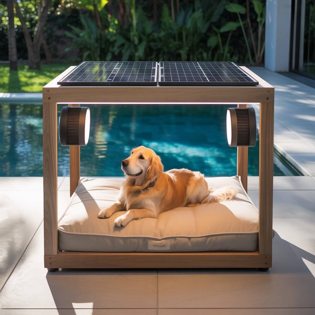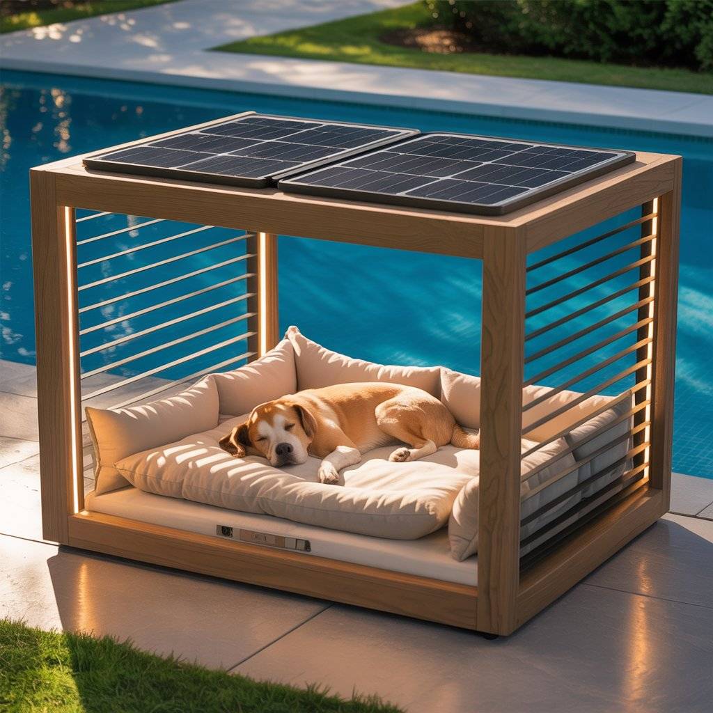 Here’s a true “modern meets practical” idea. Build a dog lounge bed with a low wood or metal frame and a covered top. Add a solar charging port on the side for plugging in small devicesor even powering a mini fan or night light.