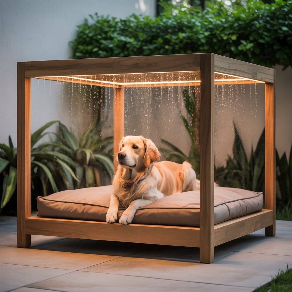 For hot regions, this one’s a lifesaver. Build a covered dog bed with a simple wooden frame and attach a smart misting system along the roof edge.