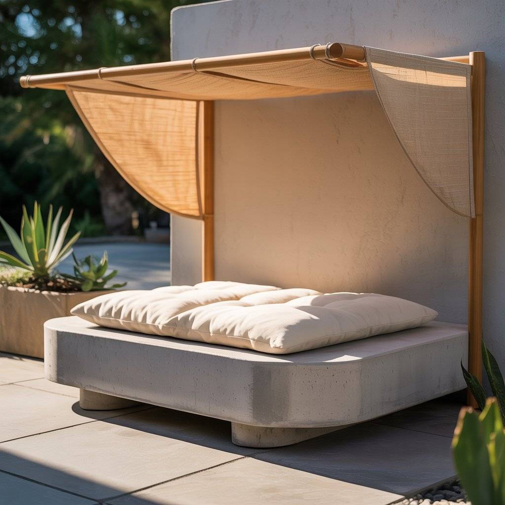 Use outdoor fabric or waterproof canvas for the cushion. This bed style looks best near concrete patios or minimalist backyards tough, functional, and sleek without being cold or uninviting.