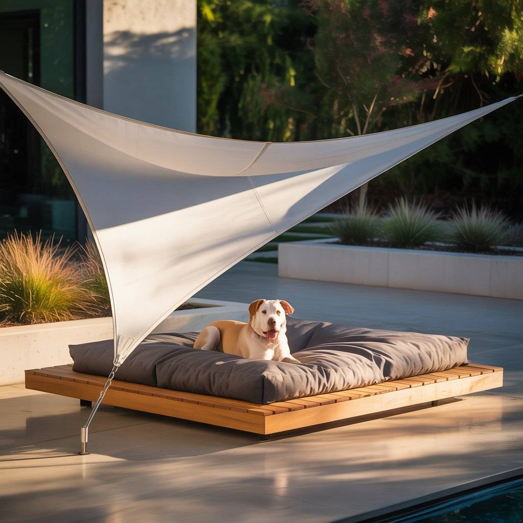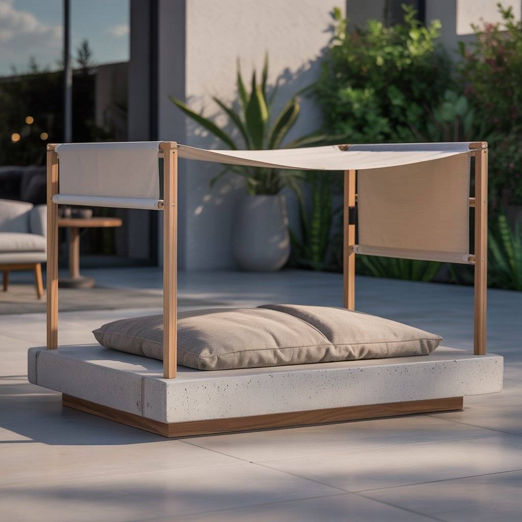Top the platform with a thick memory foam mattress covered in outdoor fabric. The raised, floating look gives that clean, architectural vibeand the smart shade keeps your dog comfortable all day.