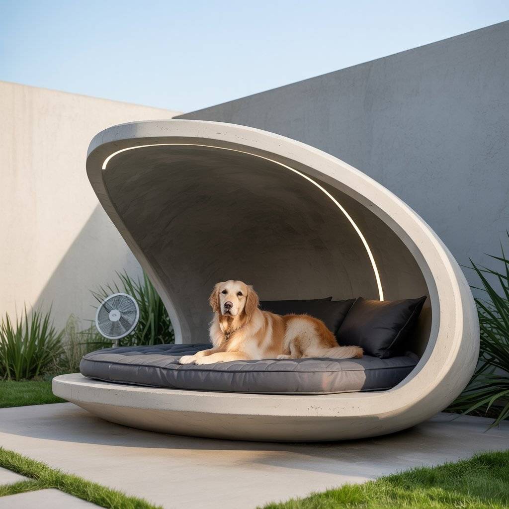 It’s perfect for warm climatesyour dog stays cool during the day and cozy at night. This “smart modern luxury” idea looks amazing beside patios or pools and needs almost no upkeep.