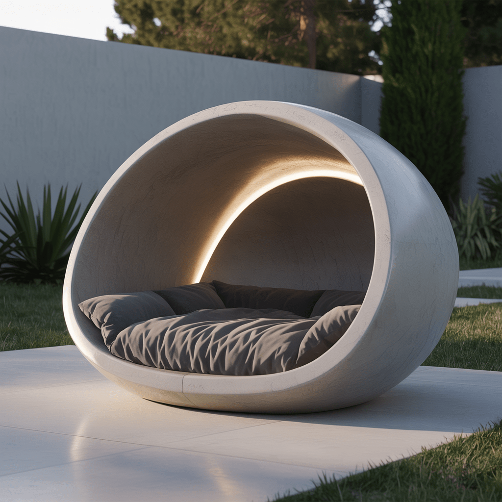 Use lightweight concrete or fiber cement to create a low, curved shell. Inside, place a memory-foam cushion wrapped in waterproof fabric.