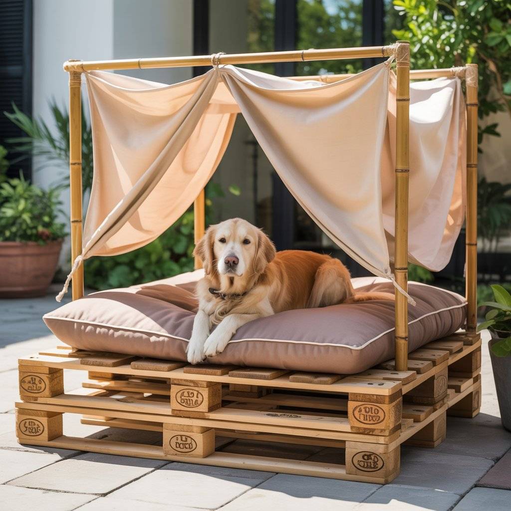 Top it with bamboo slats or weather-resistant fabric to provide filtered shade. Place a raised cushion or mattress on the base to keep your dog comfortable and off the ground.