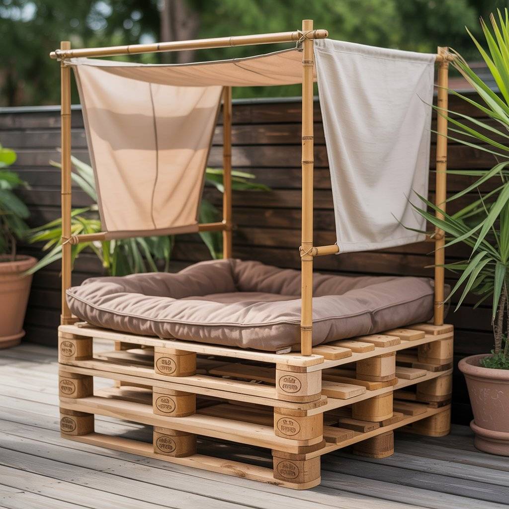 Pallets are perfect if you want something affordable and natural. Sand two or three pallets smooth, stack them for height, and secure them together. Add a simple frame at the back to hold up a light canopy made from fabric or bamboo slats.