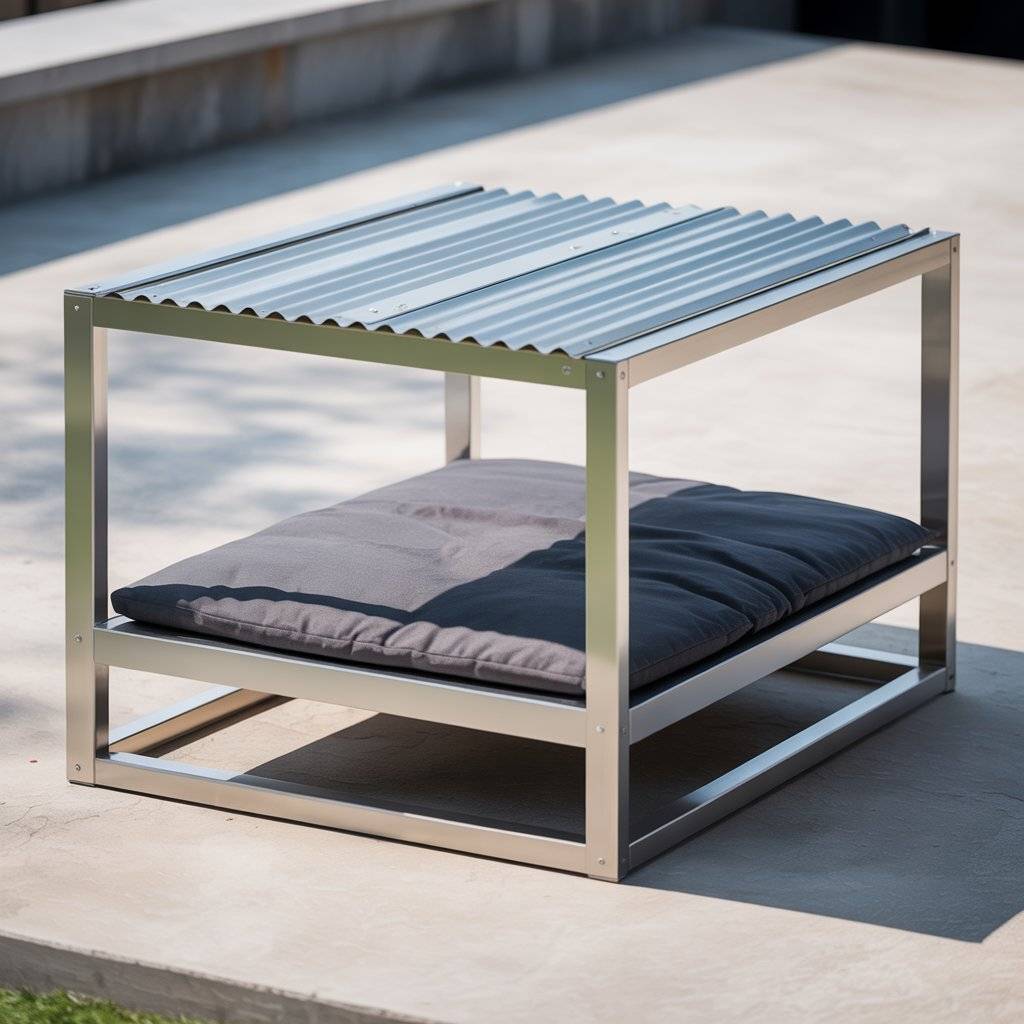 Metal works beautifully outdoorsstrong, easy to clean, and modern-looking. You can use a raised steel or aluminum frame and attach a small slanted roof made of corrugated metal or wood.