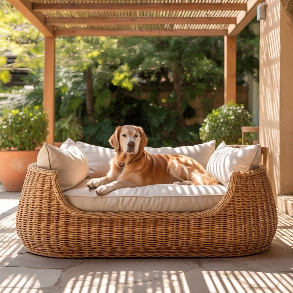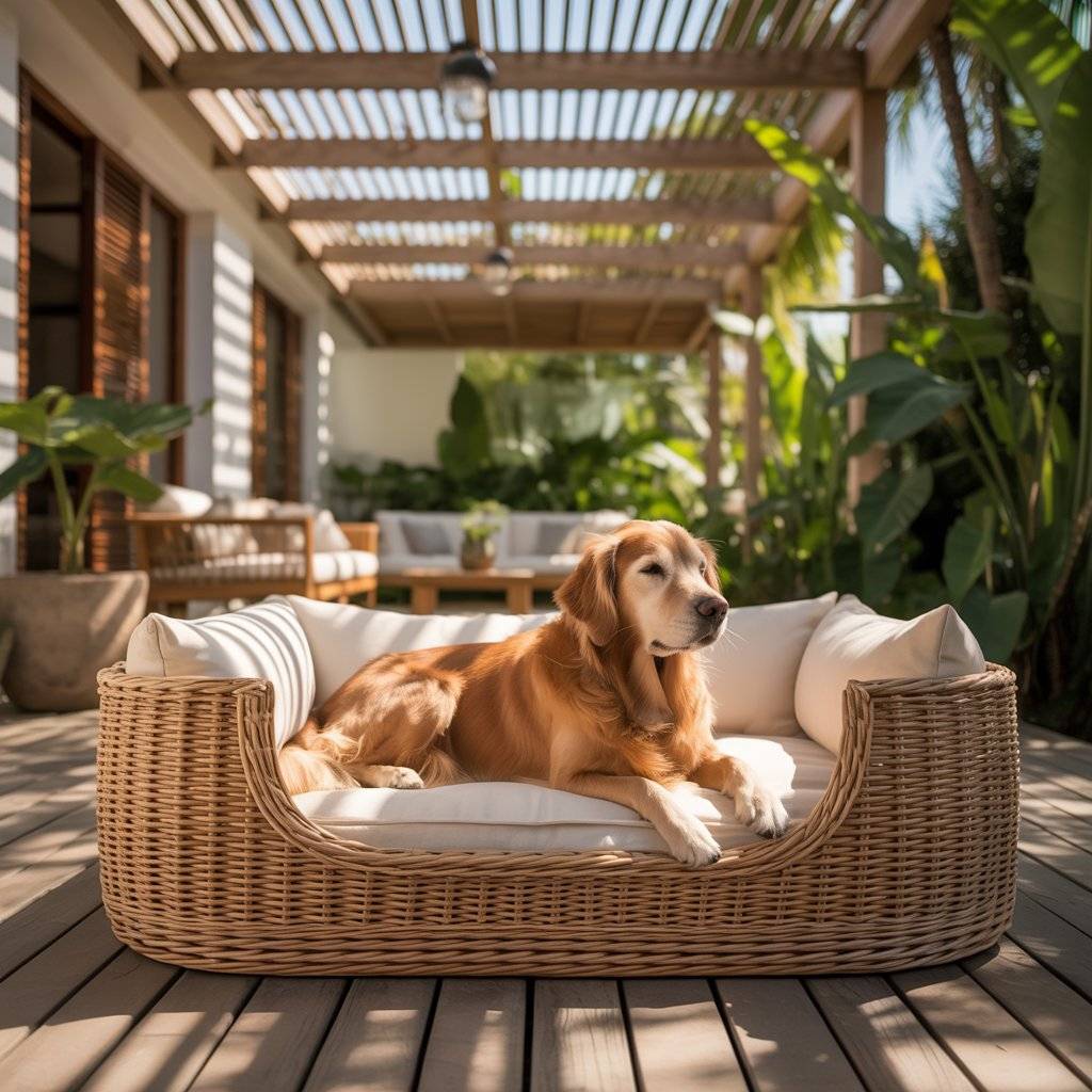 If you love that resort-style look, a rattan or wicker dog bed fits right in. You can find outdoor rattan pieces secondhand or make your own using synthetic wicker, which lasts longer outside.
