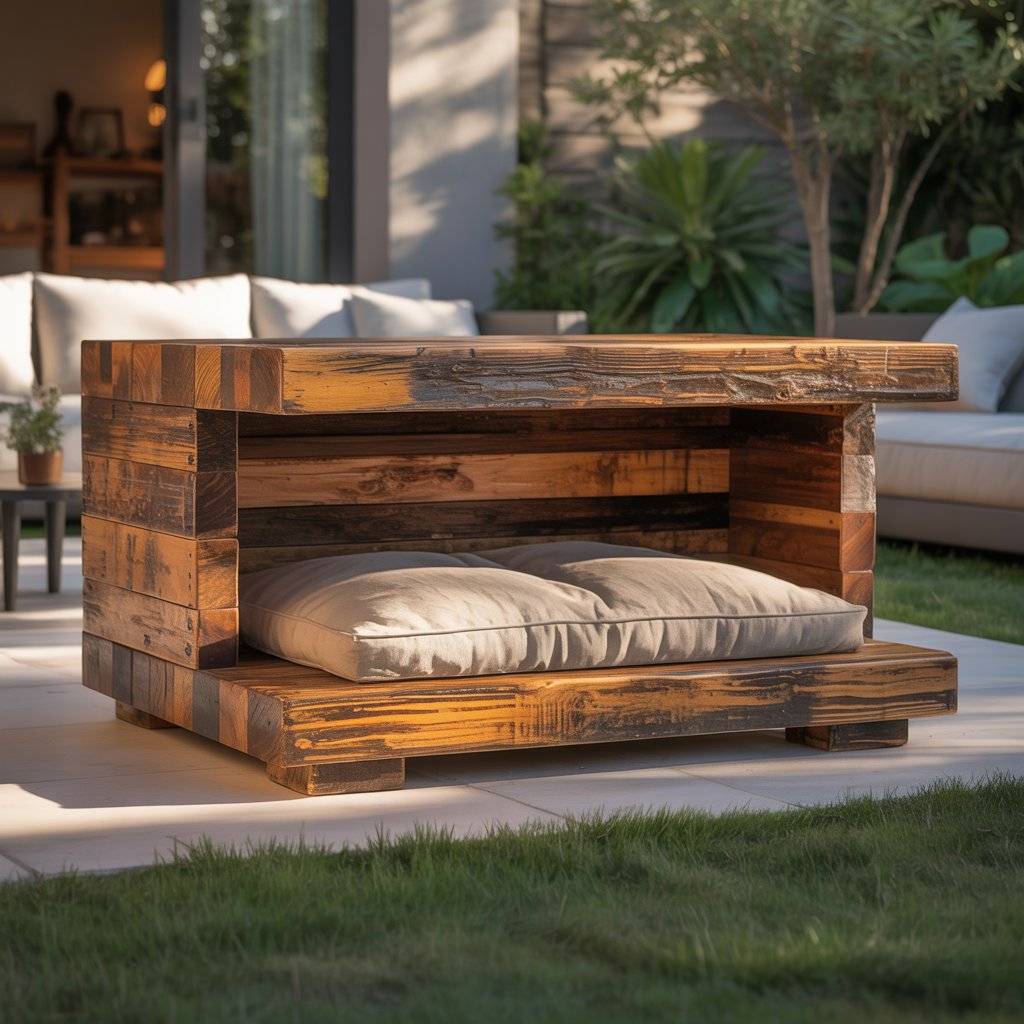 You can leave the wood natural for a warm look or paint it to match your patio furniture. It’s durable, modern, and easy to clean just brush off debris and wipe it down. Perfect for large dogs who love lounging in style.