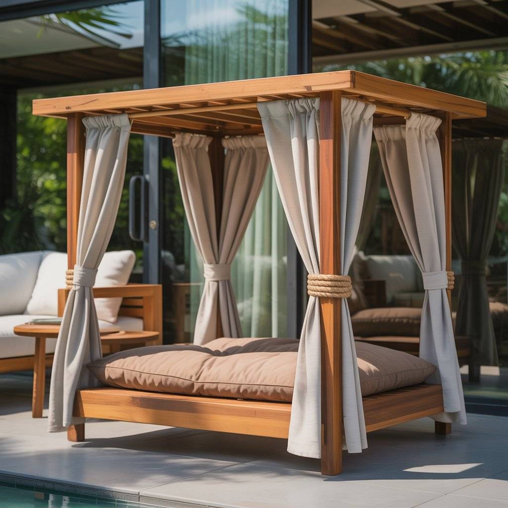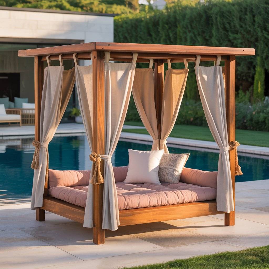If you like soft, modern design, a canopy lounge bed is a great fit. It looks elegant but is simple to build. Use a strong, low wood frame and attach a light fabric canopy overhead something like sunshade cloth or outdoor canvas.