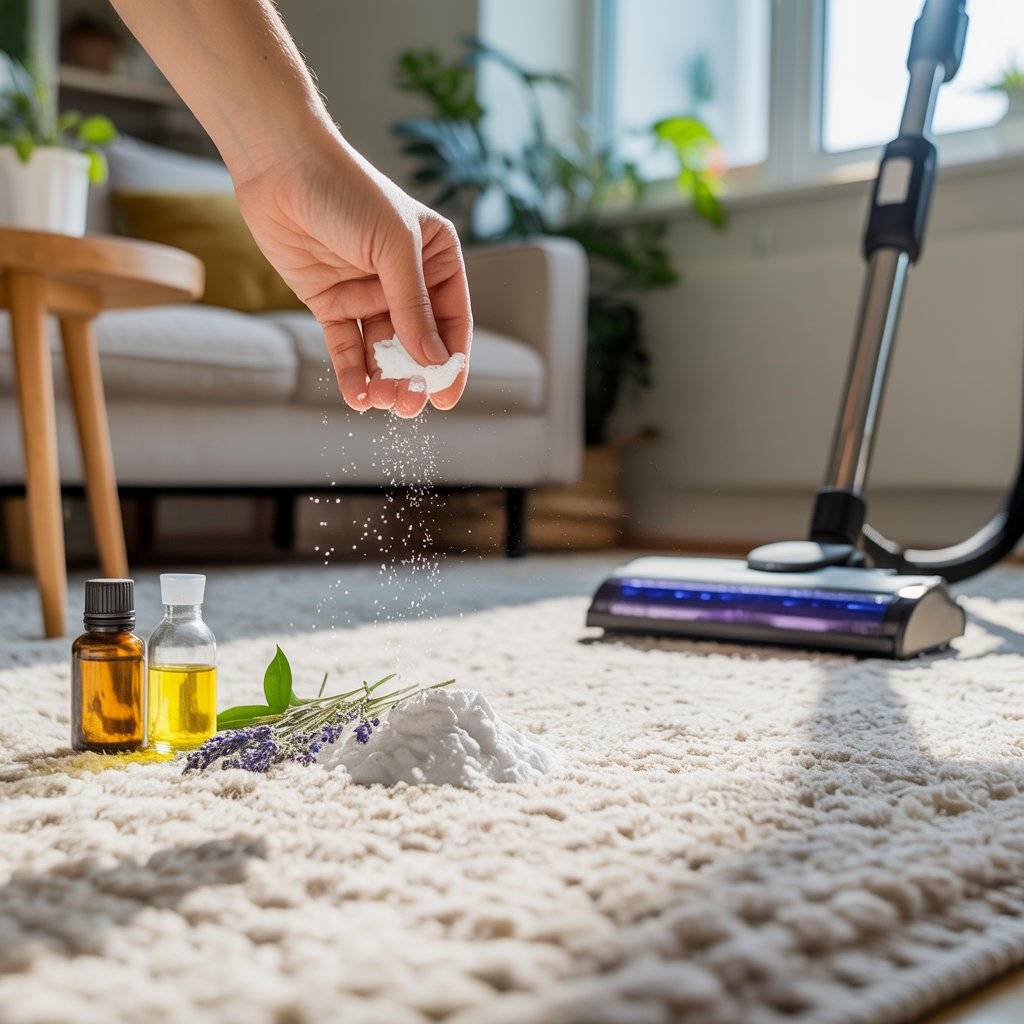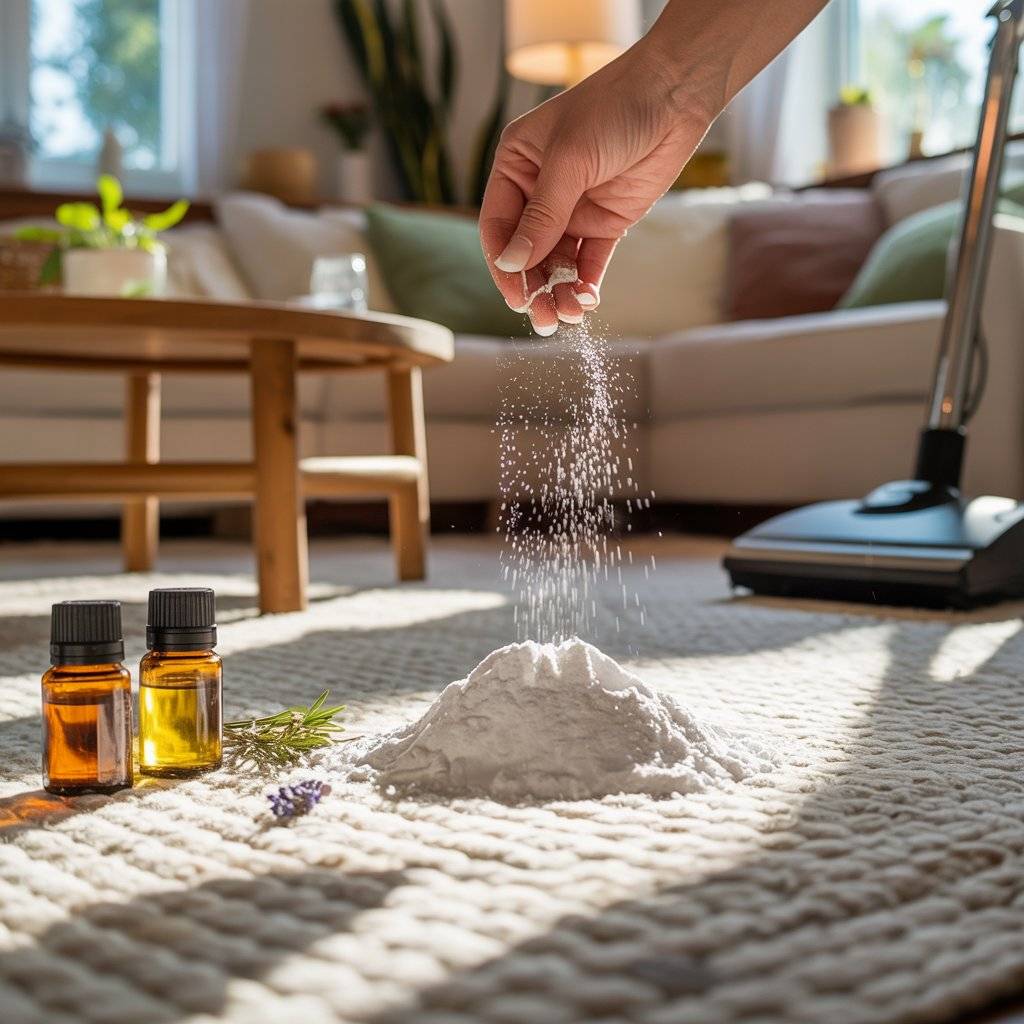 You don’t need a carpet shampooer every time your rug starts to smell. A simple deodorizing trick takes minutes. Mix baking soda with about twenty drops of your favorite essential oil (lavender, lemon, or eucalyptus work well).