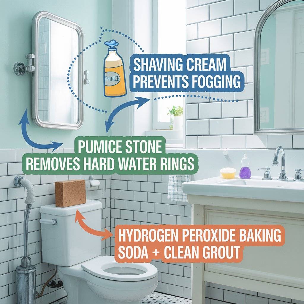 Bathrooms can be a pain, but a few pro tricks can save you from scrubbing endlessly. If your mirror fogs up every time you shower, apply a thin layer of shaving cream, let it sit for a minute, and then buff it dry. It creates a film that prevents fogging for days.