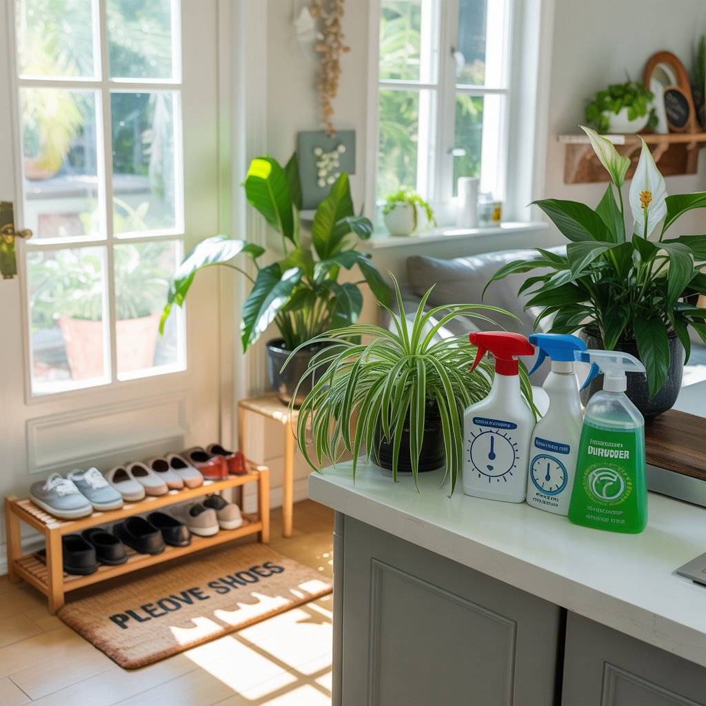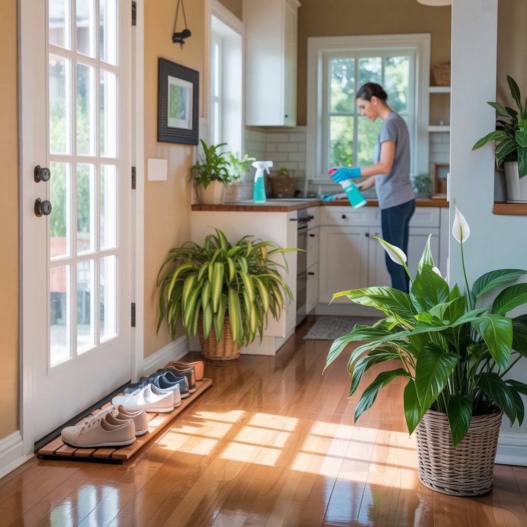 The best way to make cleaning easier is to stop bringing dirt in. Leave your shoes at the door to avoid tracking in pesticides, germs, and mud from outside. Also, consider adding a few houseplants like spider plants or peace lilies.