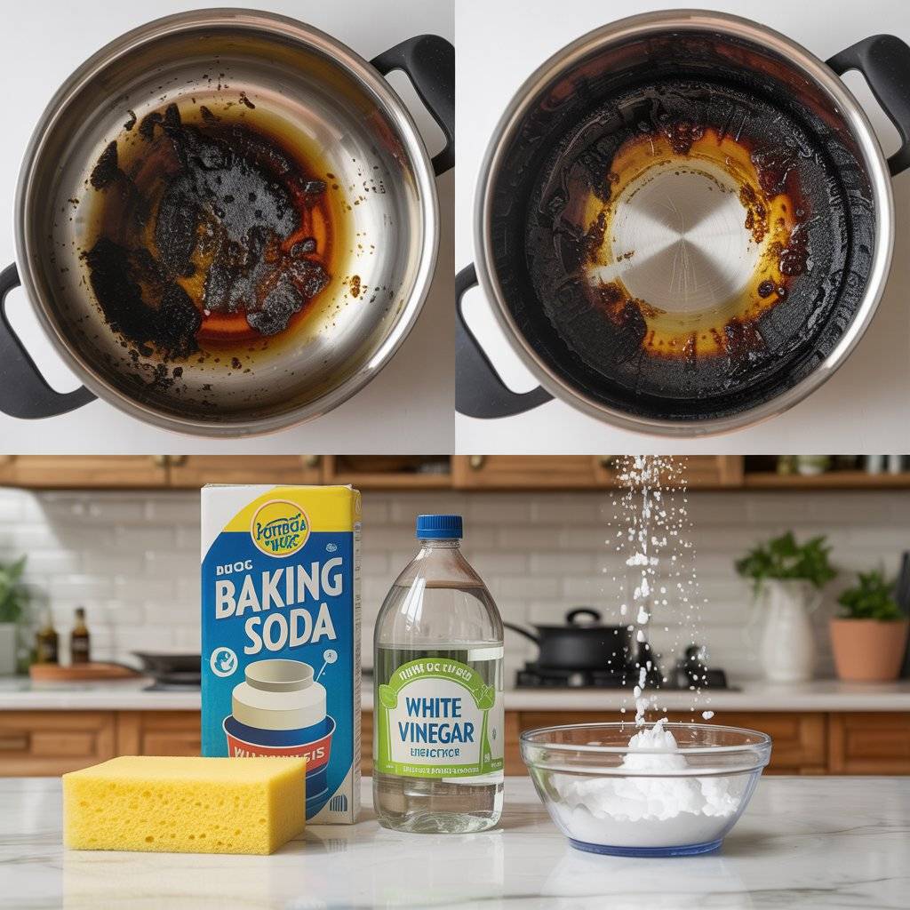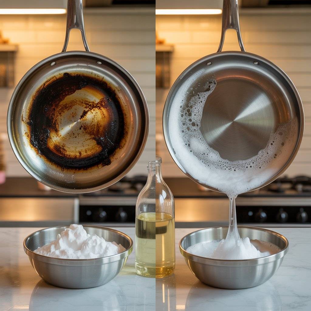 For stainless steel pans, boiling a little water with a dryer sheet in the pan can also lift stubborn burnt bits. The combination of baking soda and vinegar works on most cookware without damaging the surface.