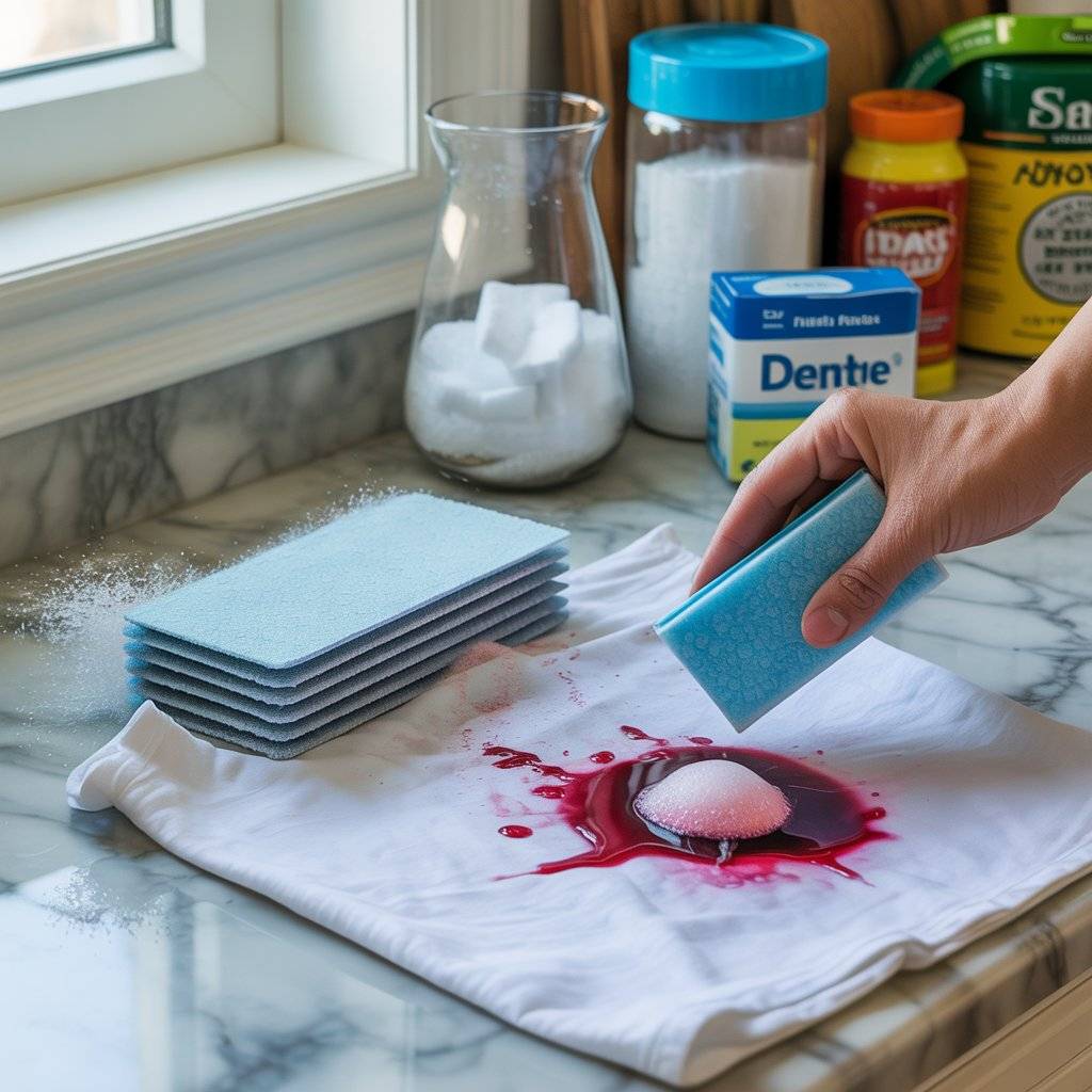 Another multi-tasker is salt. If you spill red wine on a carpet or tablecloth, blot up as much as you can, then pour a thick layer of salt over the stain. Let it sit for ten minutes. The salt pulls the wine out of the fibers. Vacuum it up, and you’ll likely see the stain gone .