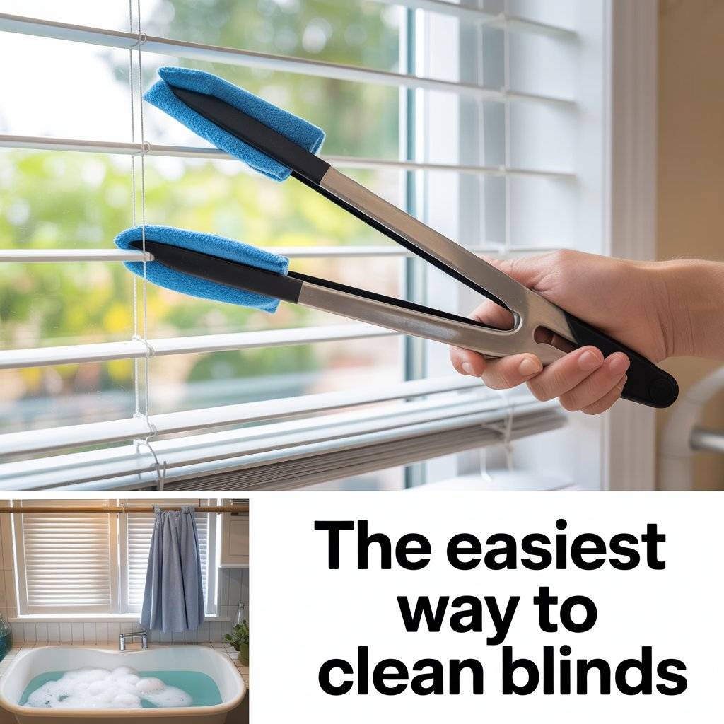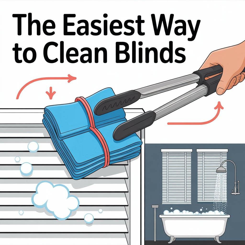 Dusty blinds are one of those chores everyone puts off because it seems tedious. Here’s a hack that changes everything. Grab a pair of tongs and wrap a microfiber cloth around each end, securing it with rubber bands.