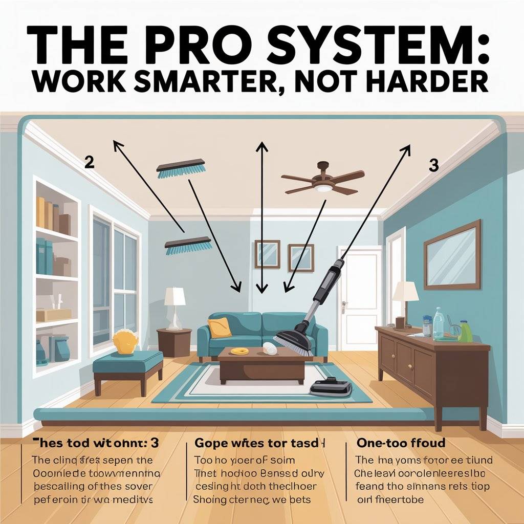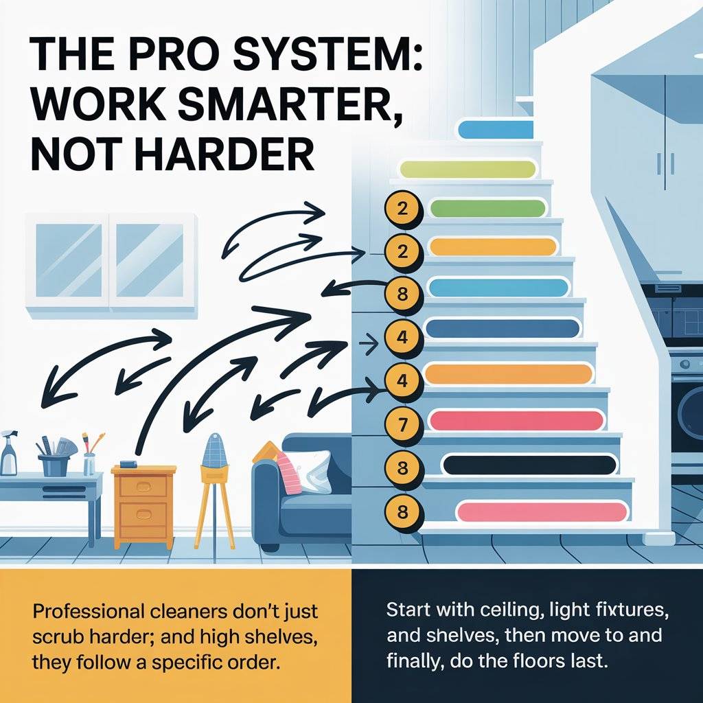 Professional cleaners don’t just scrub harder; they follow a specific order. If you want to save time, start by dusting from the top of the room and work your way down.