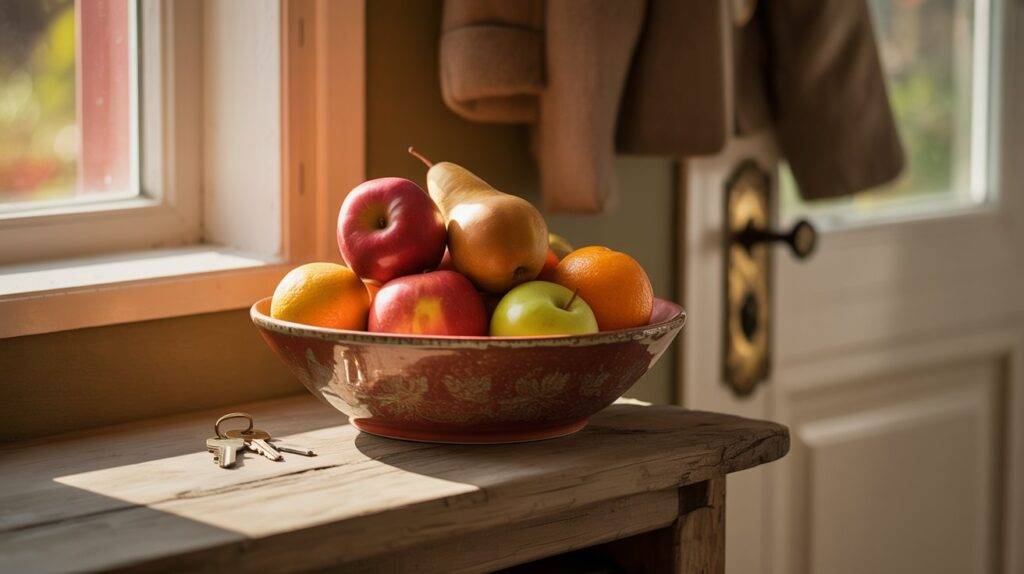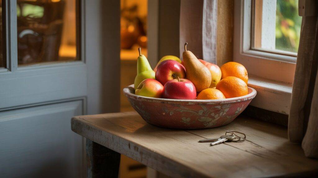 It’s practical, but it also softens that space. The door area can feel busy, even rushed. Fruit there slows it down just a little.